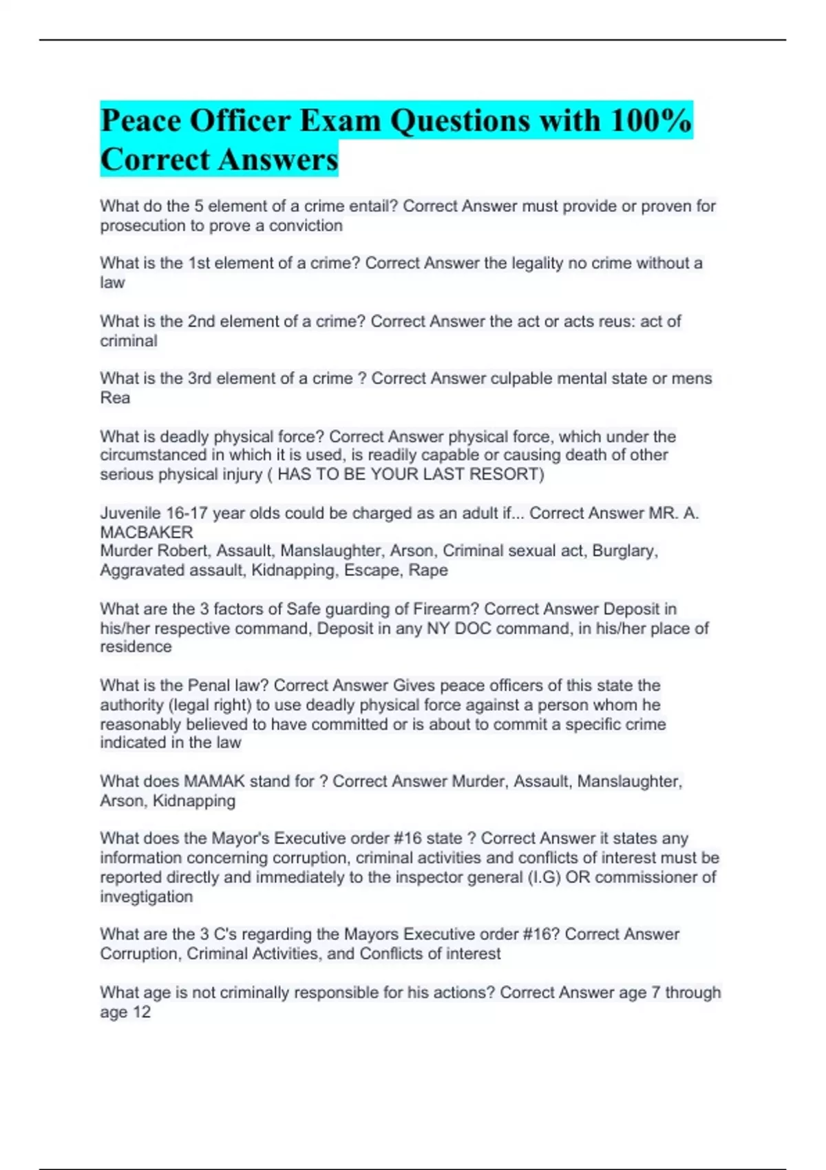 Peace Officer Exam Questions with 100% Correct Answers Basic Peace Officer Exam 2 Questions with Correct Answers Basic Peace Officer Exam 1 Questions with Complete Solutions (A+ Paper) Peace Officer Exam CO Questions with Complete Solutions Peace officer Exam CO V2 Questions with Correct Answers (A+ Paper)