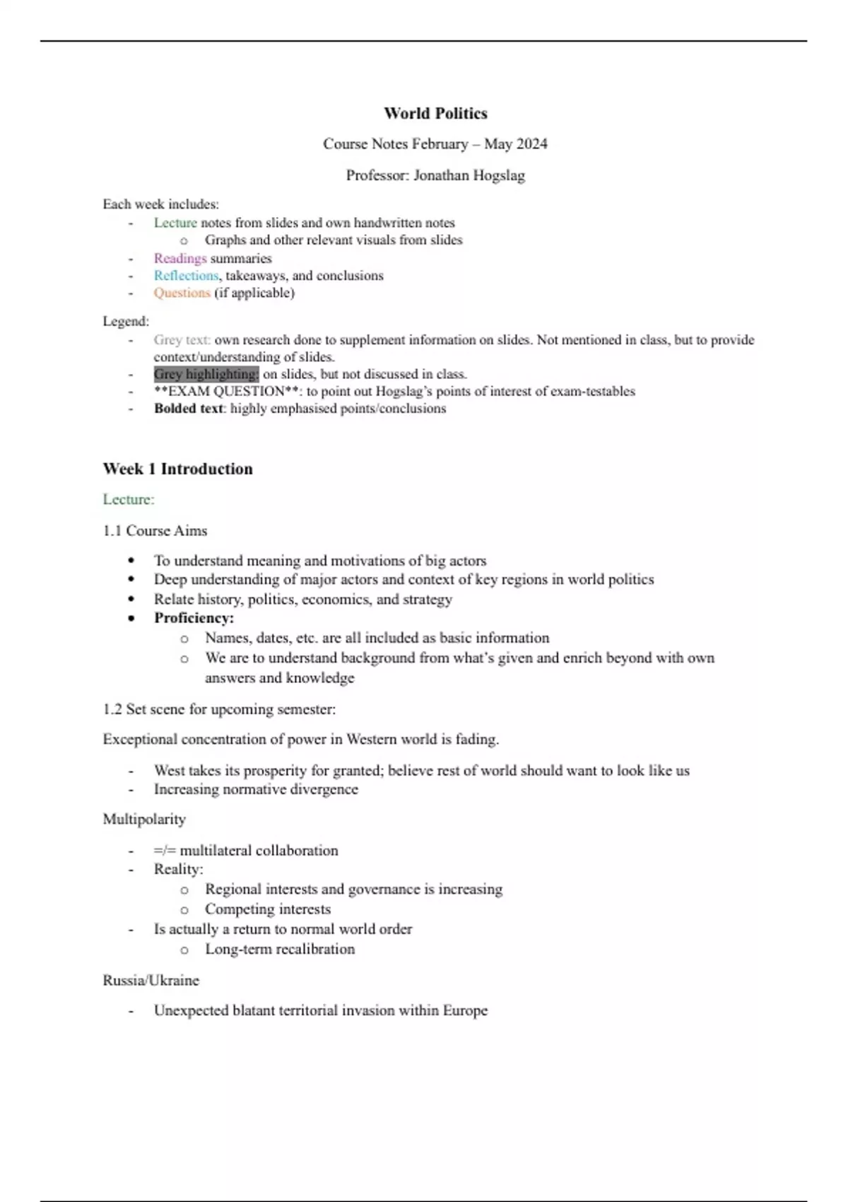 BUNDLE DEAL parts 1 and 2. A detailed summary of notes from all information from all week's lectures, slides, and class discussion, as well as additional information that provides context and facts about all information on slides. Reading summaries for the assigned readings of each week, as well as takeaways, reflections, and conclusions.