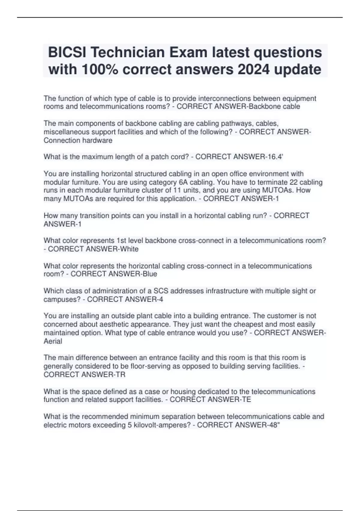 BICSI Technician Exam latest questions with 100% correct answers 2024 update BICSI Practice Test Exam 2024 Retake questions and correct answers BICSI Technician Study Guide Exam 2024 latest questions and answers BICSI TECHNICIAN Review Test Exam Guide with verified solutions 2024 BICSI Installer 1 TECHNICIAN Manuals Workbook 2024 questions and answ