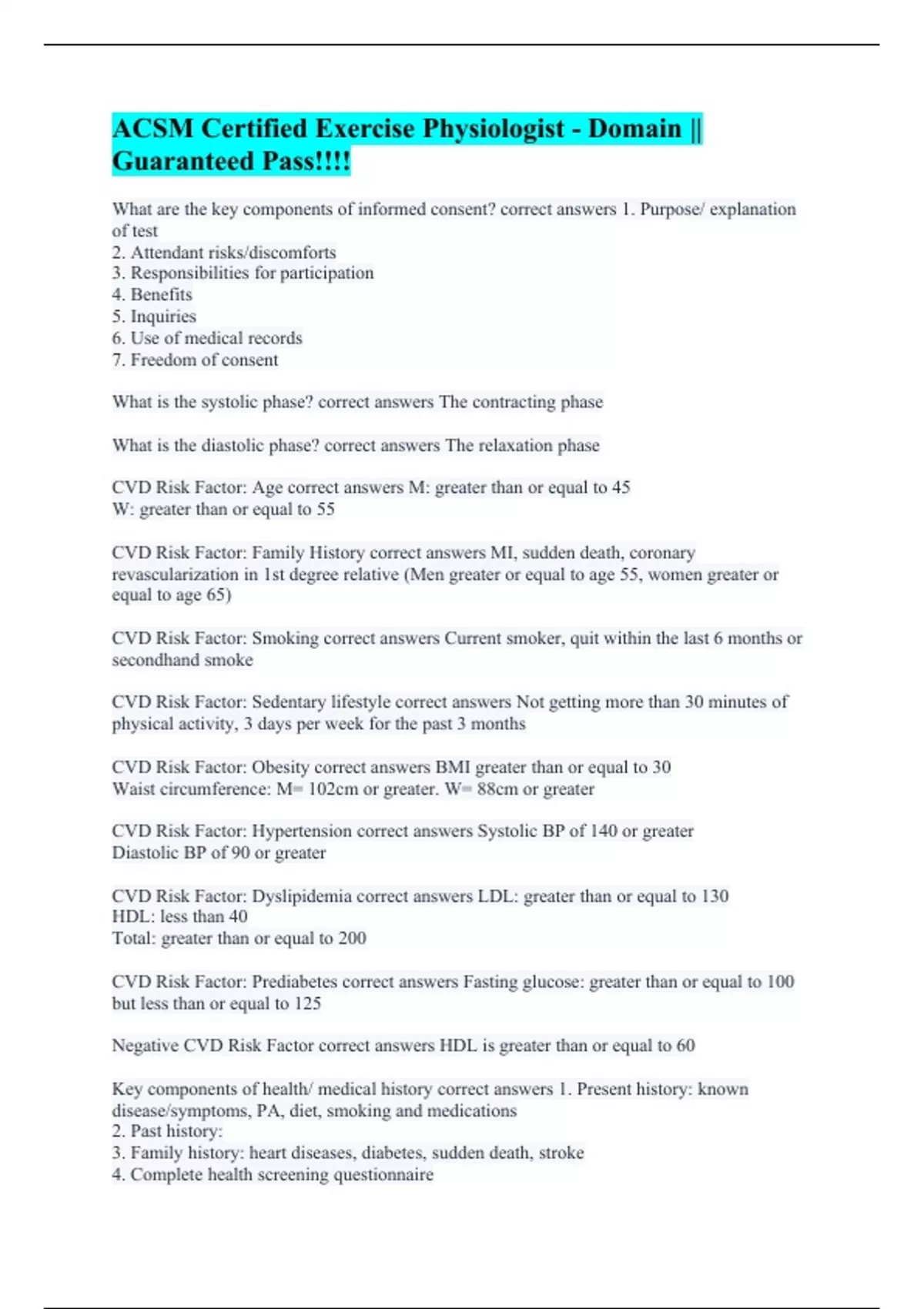 ACSM – CEP || Questions with verified answers. ACSM Clinical Exercise Physiologist Exam || Verified questions with correct answers. ACSM CPT Exam Review Questions || 100% verified answers. ACSM Personal Trainer Certification Exam || 100% correct answers. ACSM EP || Questions with complete solutions.