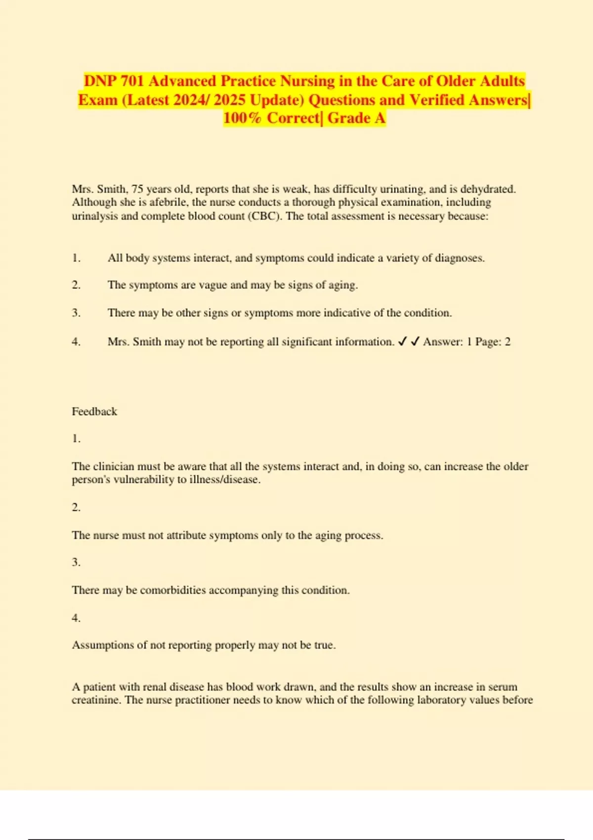 DNP 701 Advanced Practice Nursing in the Care of Older Adults Exam (Latest 2024/ 2025 Update) Questions and Verified Answers| 100% Correct| Grade A