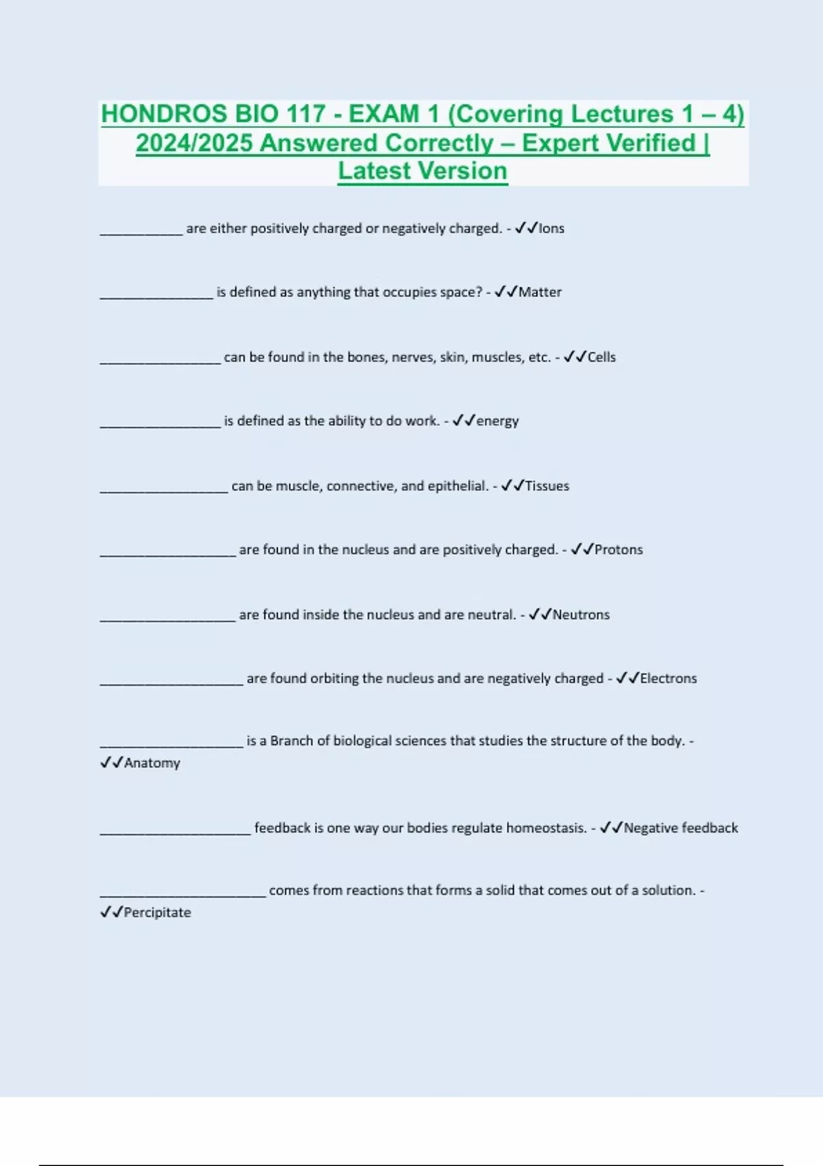 Hondros BIO 117 Exam 2 (2024/2025) Answered Correctly – Expert Verified | Latest Version