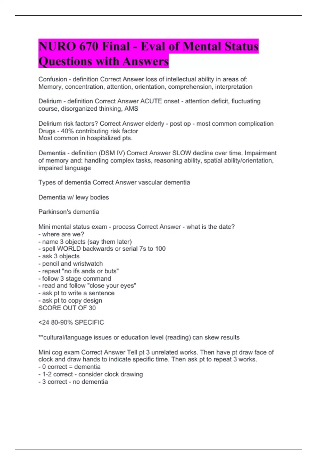 NURO 670 Final - Eval of Mental Status Questions with Answers NURO 670 Fluid and Electrolyte Disturbances Questions with 100% Correct Answers NURO 670- Genetics and hematology/immunology/coagulation Questions with Correct Answers NURO 670 Midterm Exam Questions with Correct Answers