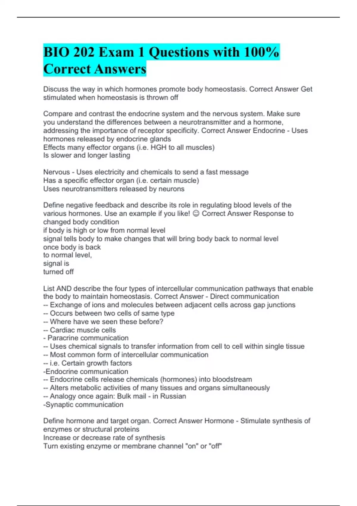 BIO 202 Exam 1 Questions with 100% Correct Answers BIO 202 Final Exam Questions with 100% Correct Answers BIO 202 Exam 1 Questions with 100% Correct Answers BIO 202 EXAM 1 Questions with Correct Answers BIO 202 Exam 1 Study Guide Questions with 100% Correct Answers Bio 202 Final Exam Review Questions with Correct Answers