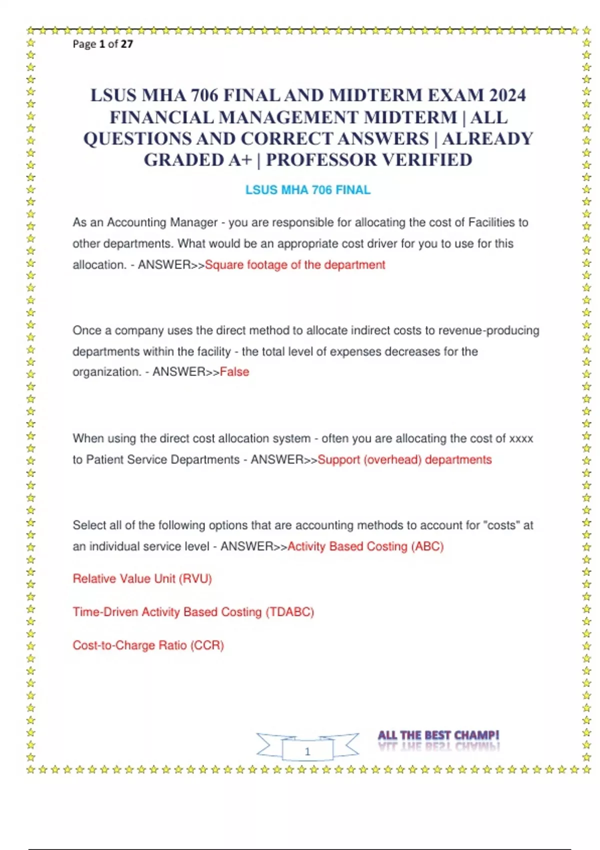 LSUS MHA 706 FINAL AND MIDTERM EXAM 2024 FINANCIAL MANAGEMENT MIDTERM ALL QUESTIONS AND CORRECT ANSWERS ALREADY GRADED A+ PROFESSOR VERIFIED