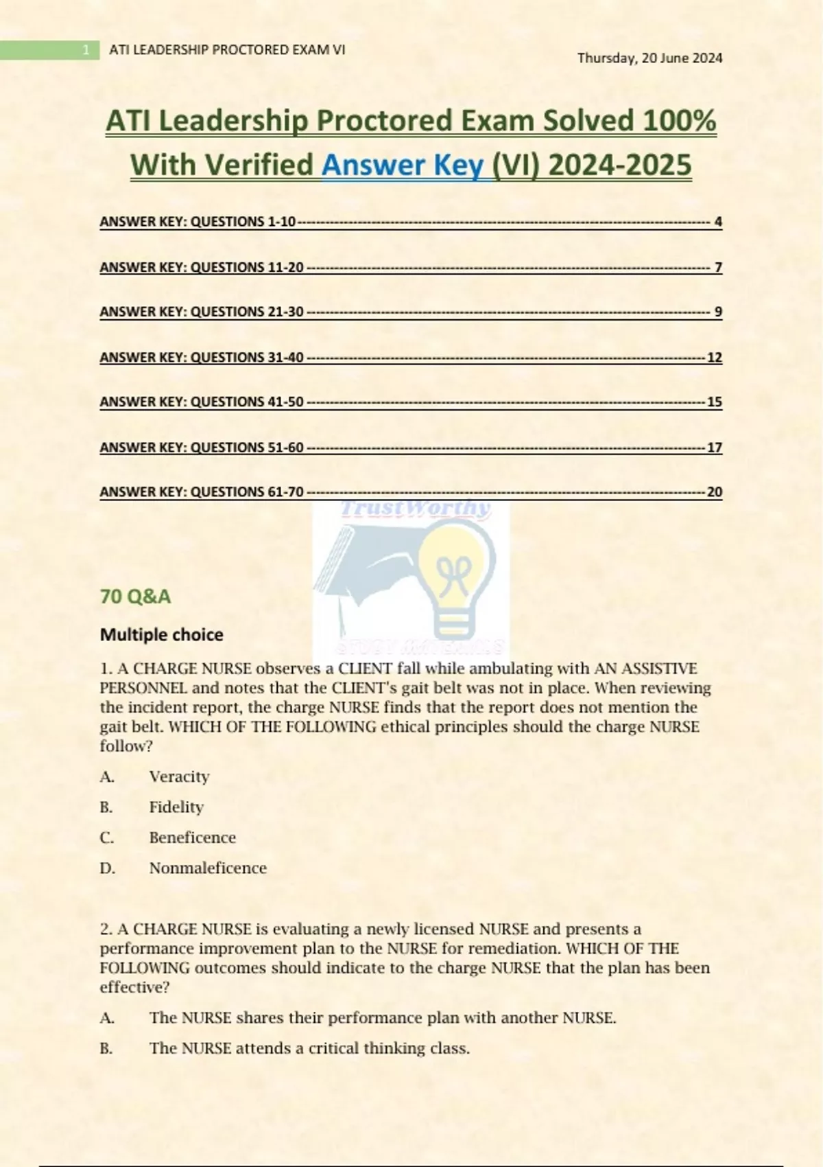 Broad; ATI RN Leadership Proctored Exams (2024/2025 ) 7 Form Each with 70 Questions Solved 100% Correct With Verified Answers/ Answer Key| Assurance A+ Score,Broad; ATI RN Leadership Proctored Exams (2024/2025 ) 7 Form Each with 70 Questions Solved 100% Correct With Verified Answers/ Answer Key| Assurance A+ Score