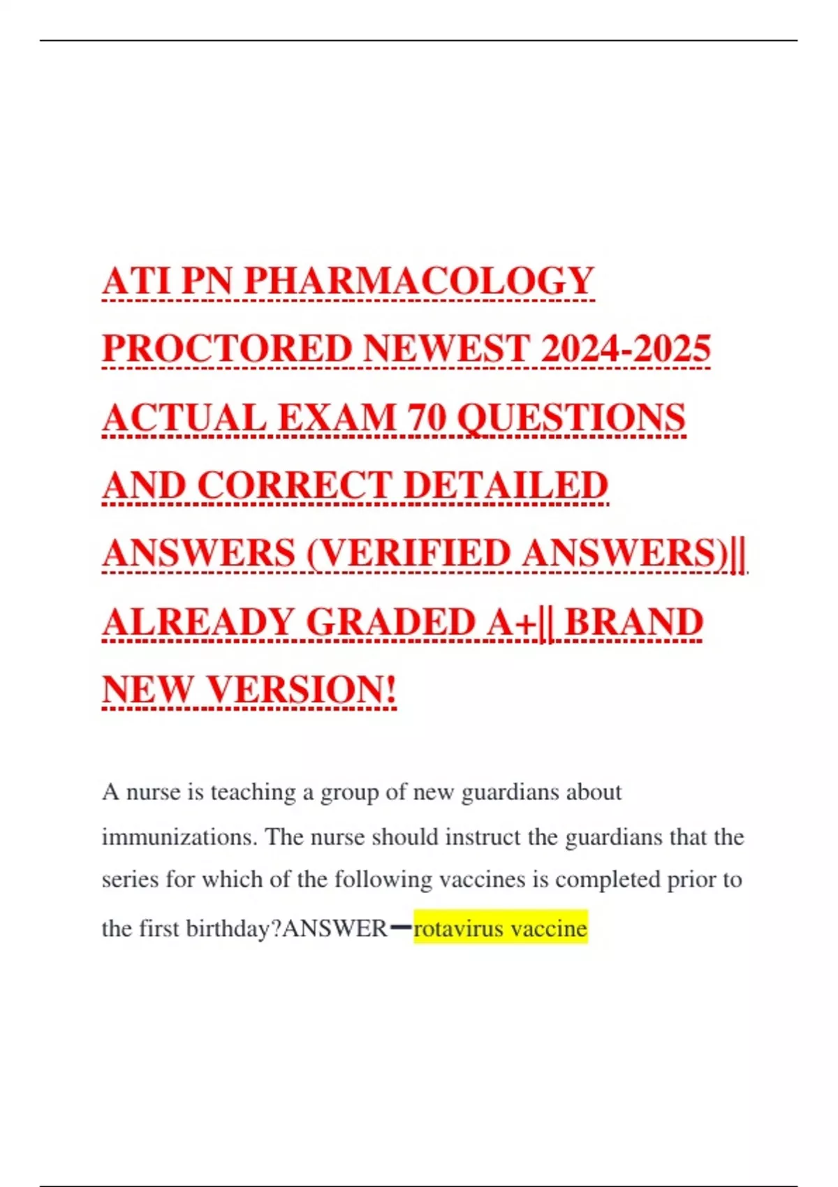ATI PN PHARMACOLOGY PROCTORED NEWEST ACTUAL EXAM 70 QUESTIONS AND CORRECT DETAILED ANSWERS (VERIFIED ANSWERS)|| ALREADY GRADED A+|| BRAND NEW VERSION! 2 Exam (elaborations) ATI PN PHARMACOLOGY PROCTORED NEWEST ACTUAL EXAM 70 QUESTIONS AND CORRECT DETAILED ANSWERS (VERIFIED ANSWERS)|| ALREADY GRADED A+|| BRAND NEW VERSION! 3 Ex