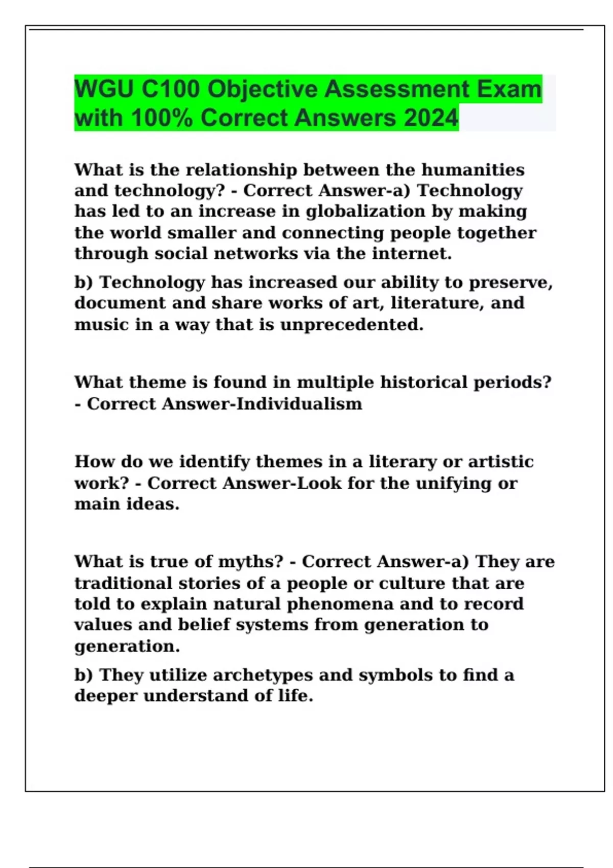 Package deal for WGU C100 Humanities Exam Questions with 100% Correct Answers | Verified | Latest Update 2024
