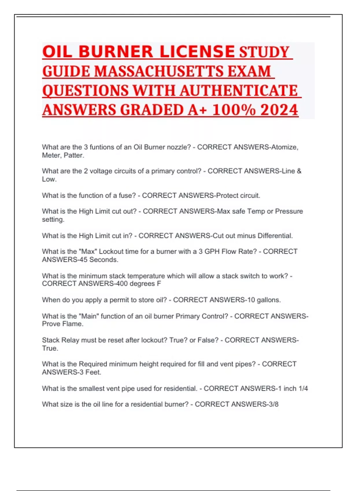 OIL BURNER LICENSE STUDY GUIDE MASSACHUSETTS EXAM QUESTIONS WITH AUTHENTICATE ANSWERS GRADED A+ 100% 2024