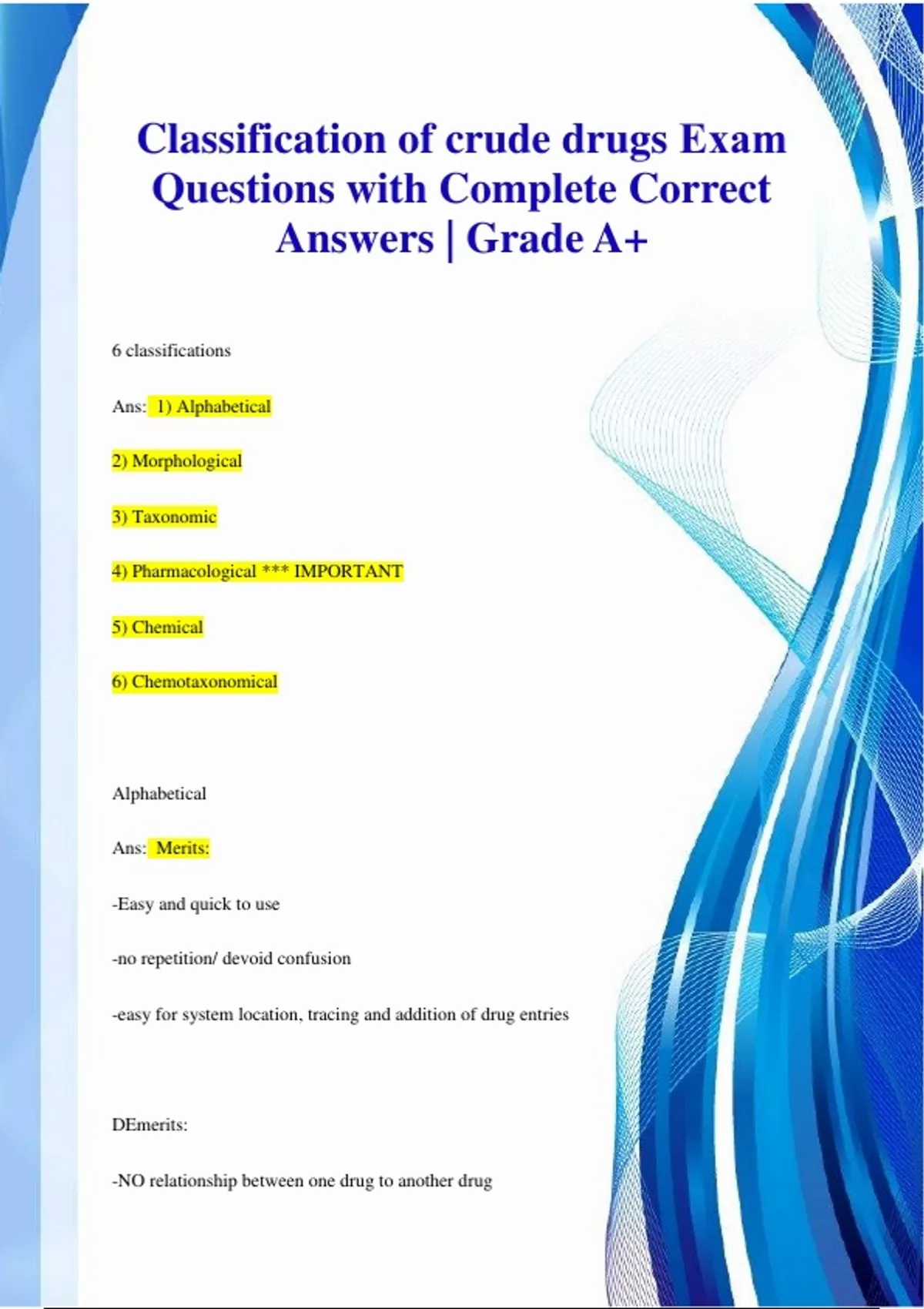 Drug Classification Exam Pack Questions with Complete Correct Answers | Grade A+