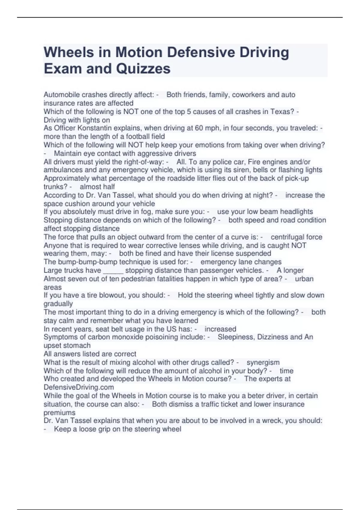 Exam (elaborations) Defensive Driving final exam | Questions and answers | Latest 2024/25 2 Exam (elaborations) Defensive Driving Questions and answers | Updated | RATED A+ 3 Exam (elaborations) Defensive Driving Course: Final Exam | With complete solution | Updated 4 Exam (elaborations) Defensive Driving School Final Test | 100% VERIFIED CORREC