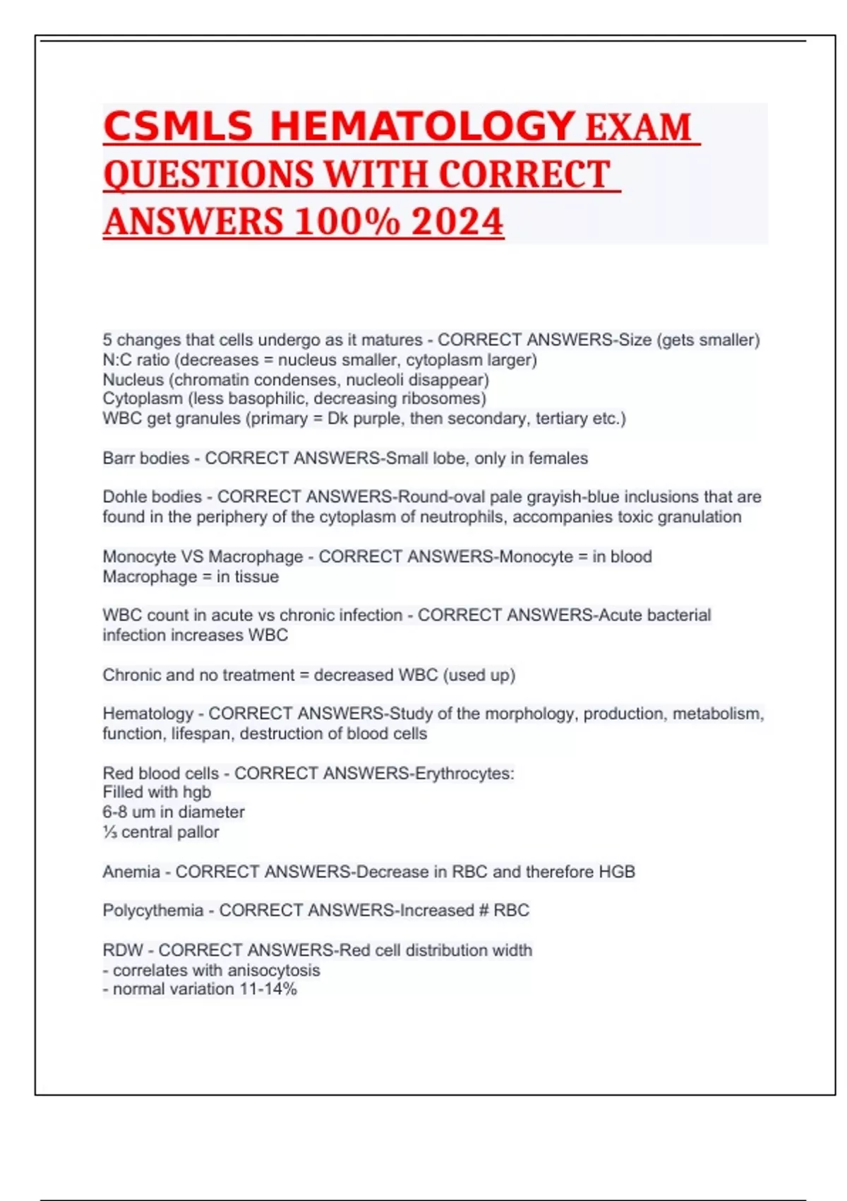 HEMATOLOGY ANEMIAS EXAM WITH CORRECT ANSWERS 2024 PANCE HEMATOLOGY EXAM WITH CORRECT ANSWERS 2024 HEMATOLOGY/ONCOLOGY ROSH REVIEW EXAM 2024 HEMATOLOGY PATHO 2 CERTIFICATION EXAM 2024 WITH CORRECT ANSWERS HEMATOLOGY MNEMONICS CHAPTER 18 EXAM IV WITH CORRECT ANSWERS 2024 HEMATOLOGY MNEMONICS EXAM WITH CORRECT ANSWERS 2024 HEMATOLOGY I CHAPTERS 5-7 ST