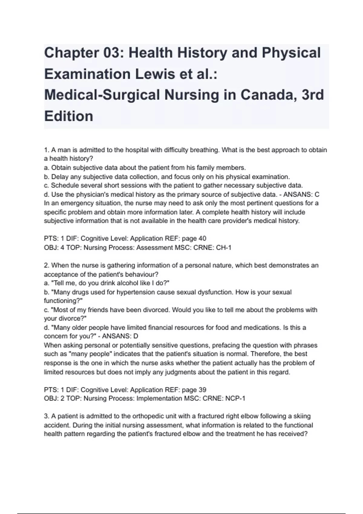 Complete Test Bank Physical Examination and Health Assessment CANADIAN 3rd Edition Jarvis 2024/2025 Questions & Answers with rationales (Chapter 1-31)ALL BUNDLED HERE!!!)