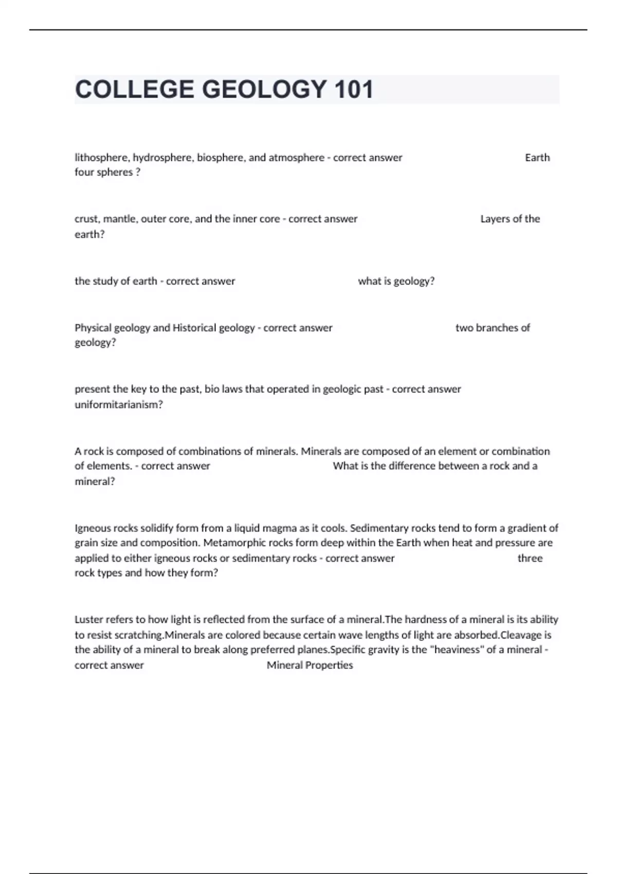 1 Exam (elaborations) Geology practice test Questions And Correct Verified Answers. 2 Exam (elaborations) COLLEGE GEOLOGY 101 Comprehensive Actual Exam Questions And Answers Guaranteed Pass. 3 Exam (elaborations) Geology Test #1 Actual Questions With Complete Answers 100% Verified Answers. 4 Exam (elaborations) Fundamentals of Geology Real Exam