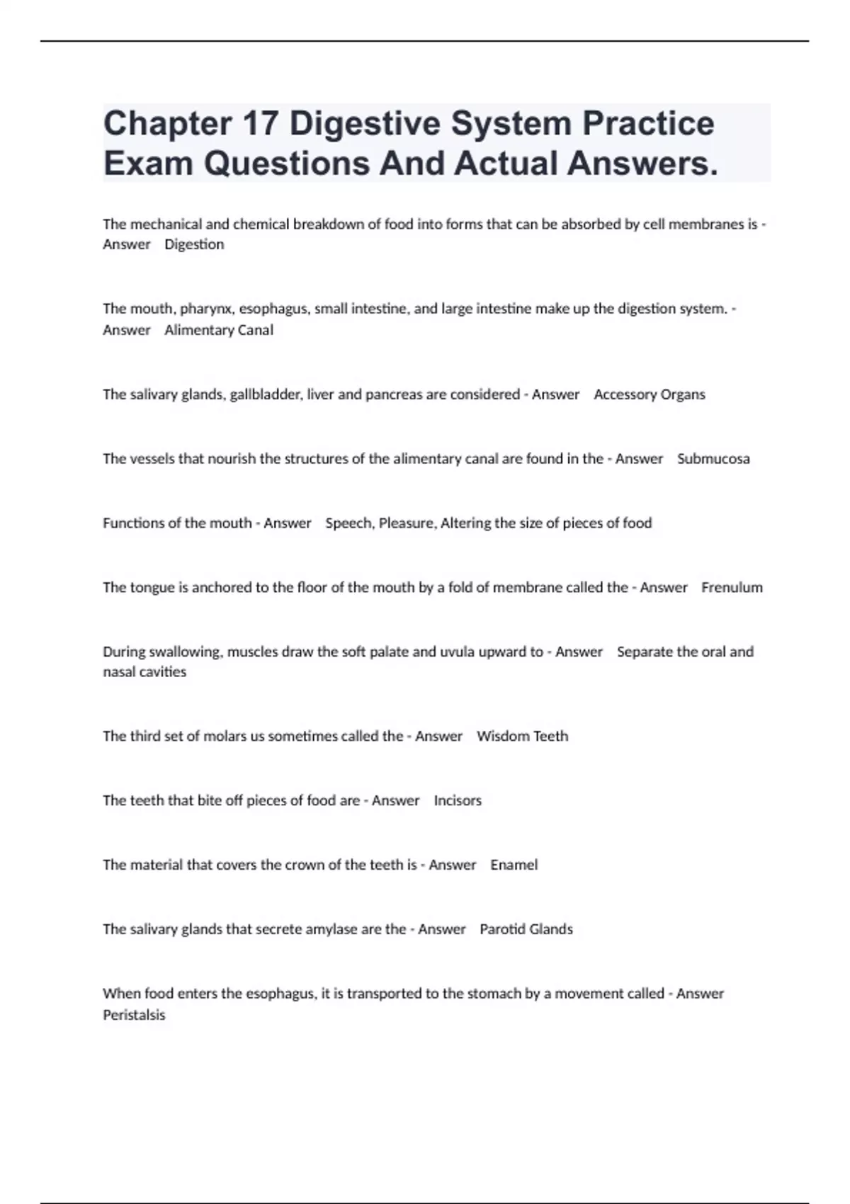 1 Exam (elaborations) Practice Test Digestive System Questions Fully Solved. 2 Exam (elaborations) Digestive System Final Exam Questions And Answers Already Passed. 3 Exam (elaborations) Test - Digestive System Questions With All Correct Answers. 4 Exam (elaborations) Digestive System Test Questions With Complete Verified Solutions.