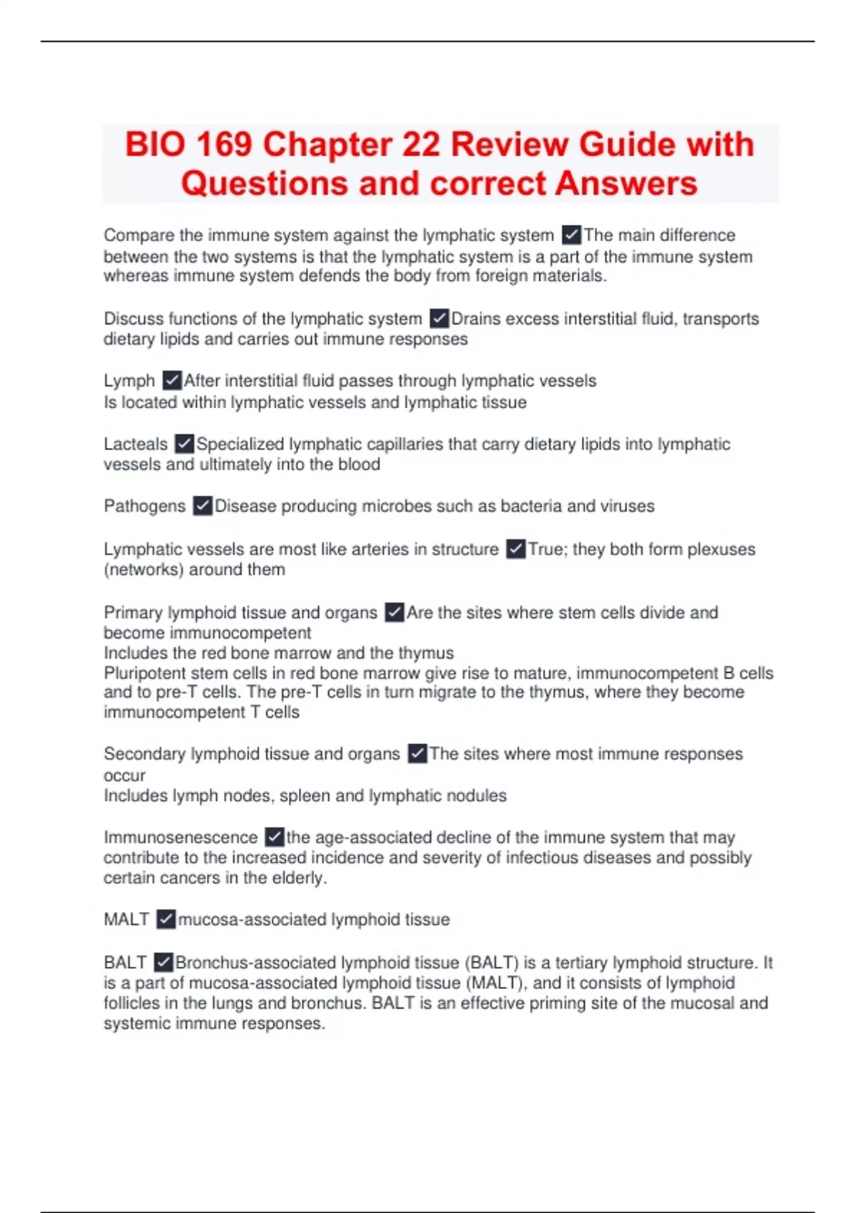 BIO 169 Lymphatic System Review Questions and Correct Answers
