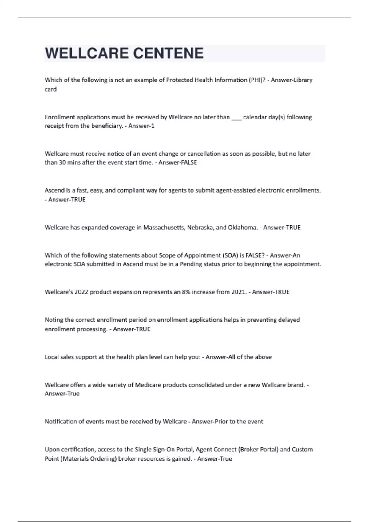 WELLCARE CENTENE QUESTIONS WITH 100 % CORRECT ANSWERS | VERIFIED