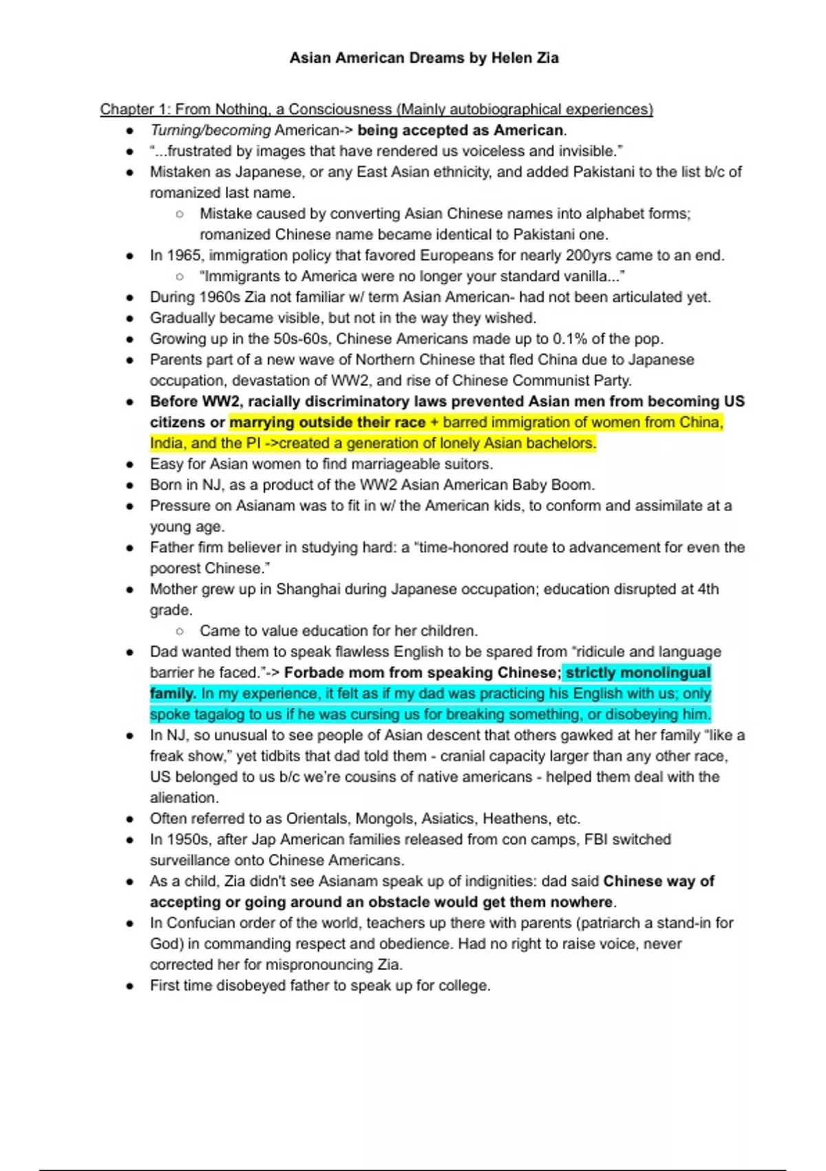 Chapter Notes: Asian American Dreams by Helen Zia (ch. 1-5, 7-10)
