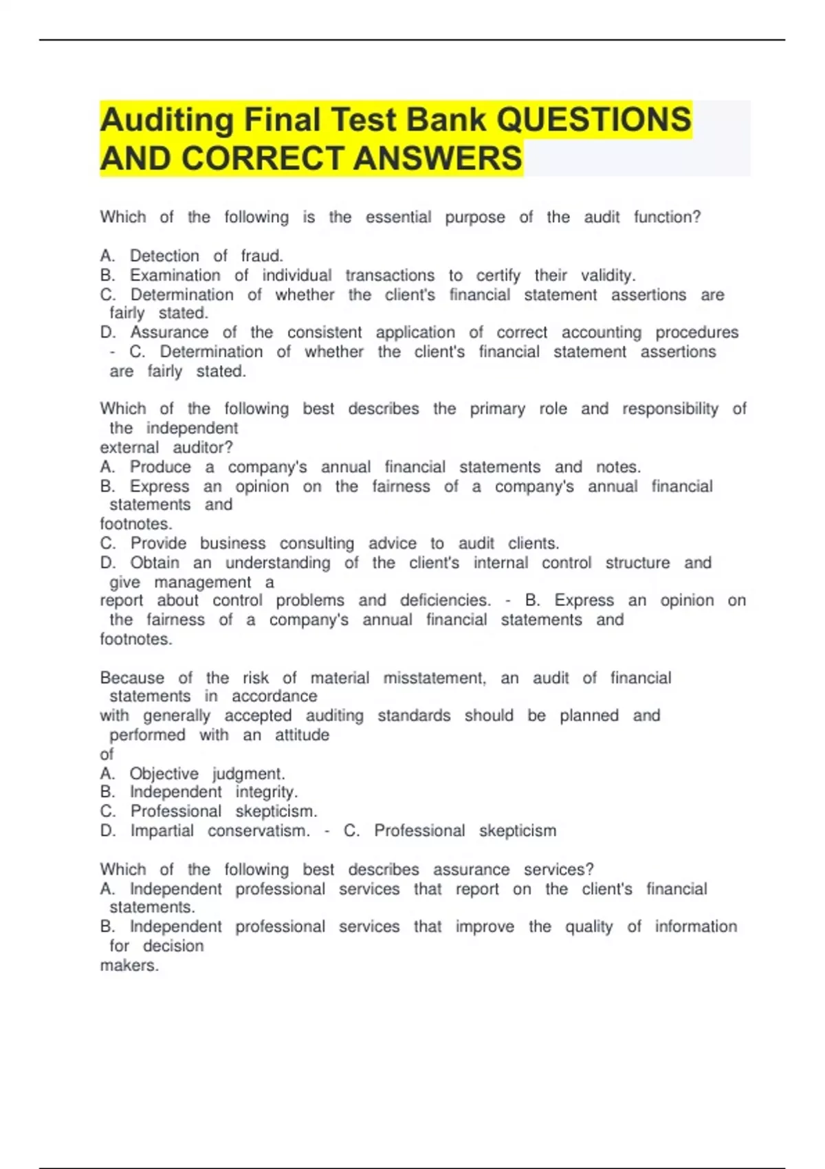 1 Exam (elaborations) 18 Auditing and Assurance Services 2 Exam (elaborations) AAT Level 4 Audit and Assurance Chapter 1 3 Exam (elaborations) Auditing Final Test Bank 4 Exam (elaborations) Auditing Week 12 Review Quiz 5 Exam (elaborations) Auditing & Assurance Services Chapter 11 6 Exam (elaborations) Auditing and Assurance Services 7 Exam (
