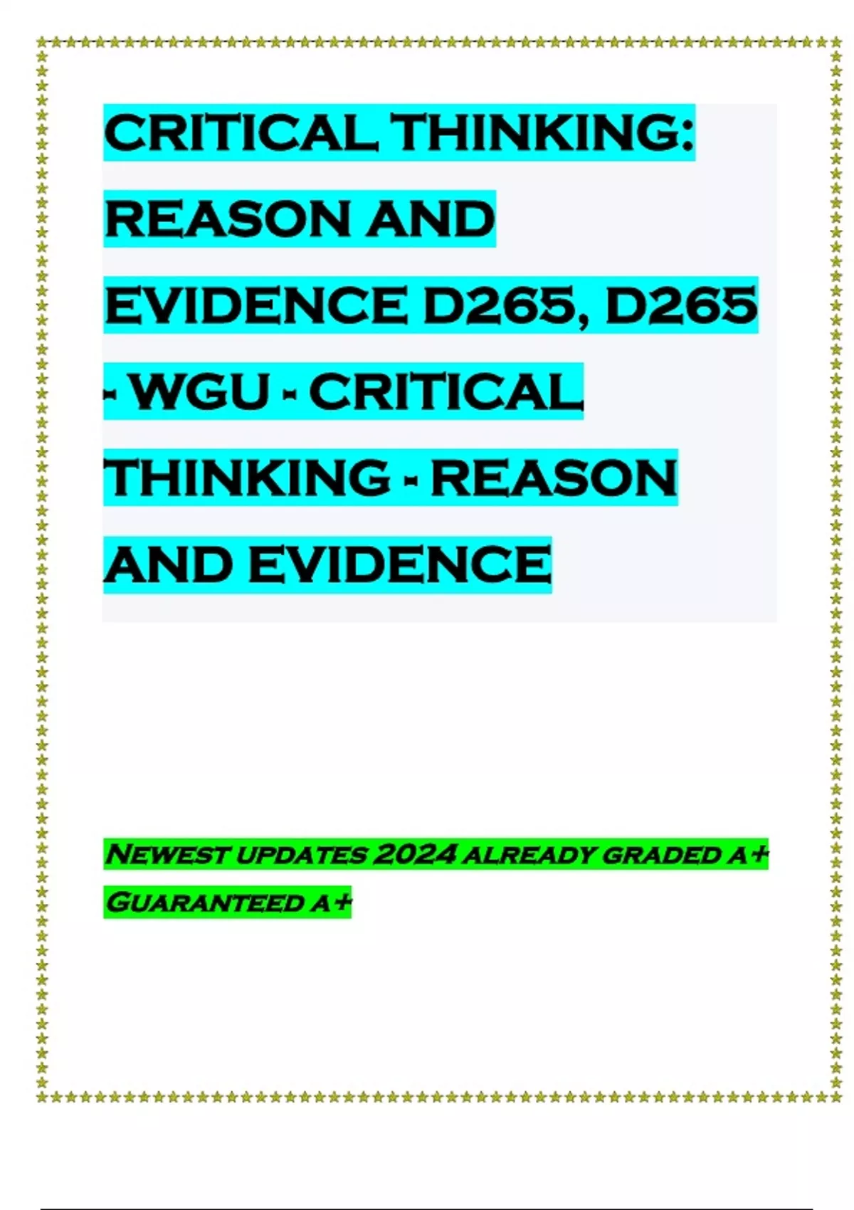 1 Exam (elaborations) Wgu D220 Nursing Informatics Exam With All 300 Questions And Correct Answers Graded A+| 2 Exam (elaborations) Critical Thinking: Reason and Evidence D265, D265 - WGU - Critical 3 Exam (elaborations) CRITICAL THINKING: REASON AND EVIDENCE D265, D265 - WGU - CRITICAL THINKING - REASON AND EVIDENCE 4 Exam (elaborations)