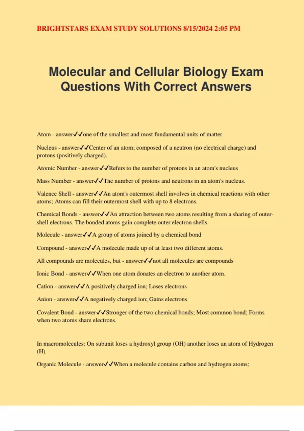 Molecular and Cellular Biology Exam Questions With Correct Answers