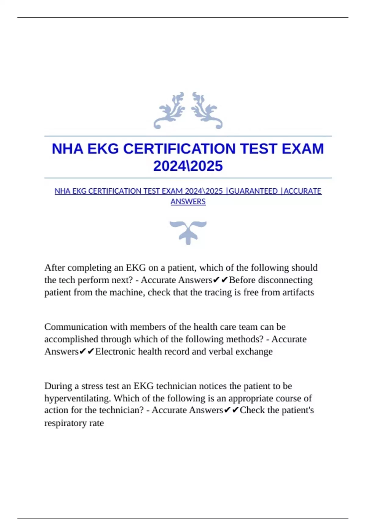 NHA EKG CERTIFICATION EXAM WITH GUARANTEED ACCURATE ANSWERS |VERIFIED NHA EKG CERTIFICATION TEST EXAM |GUARANTEED |ACCURATE ANSWERS NHA NOW EKG TECHNICIAN EXAM QUESTIONS WITH GUARANTEED ACCURATE ANSWERS