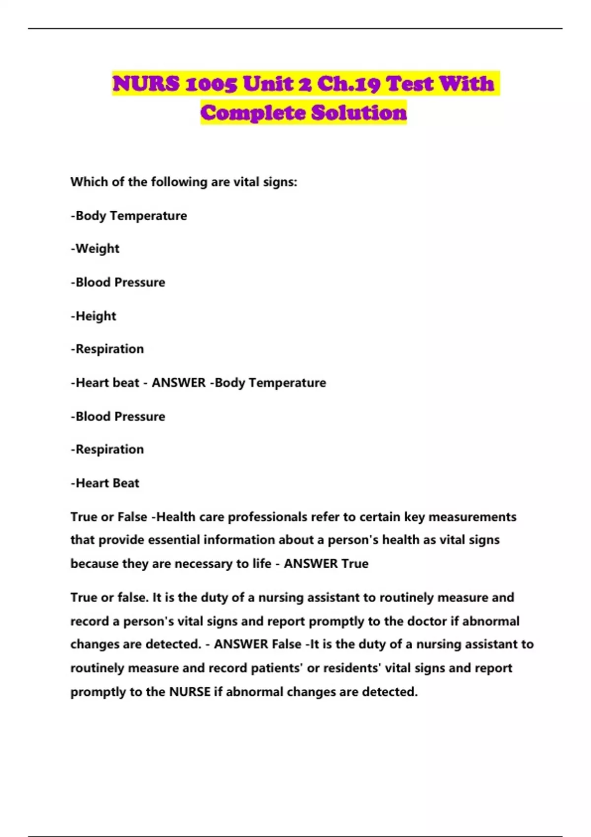 NURS 1005 Unit 2 Ch.19 Test With Complete Solution