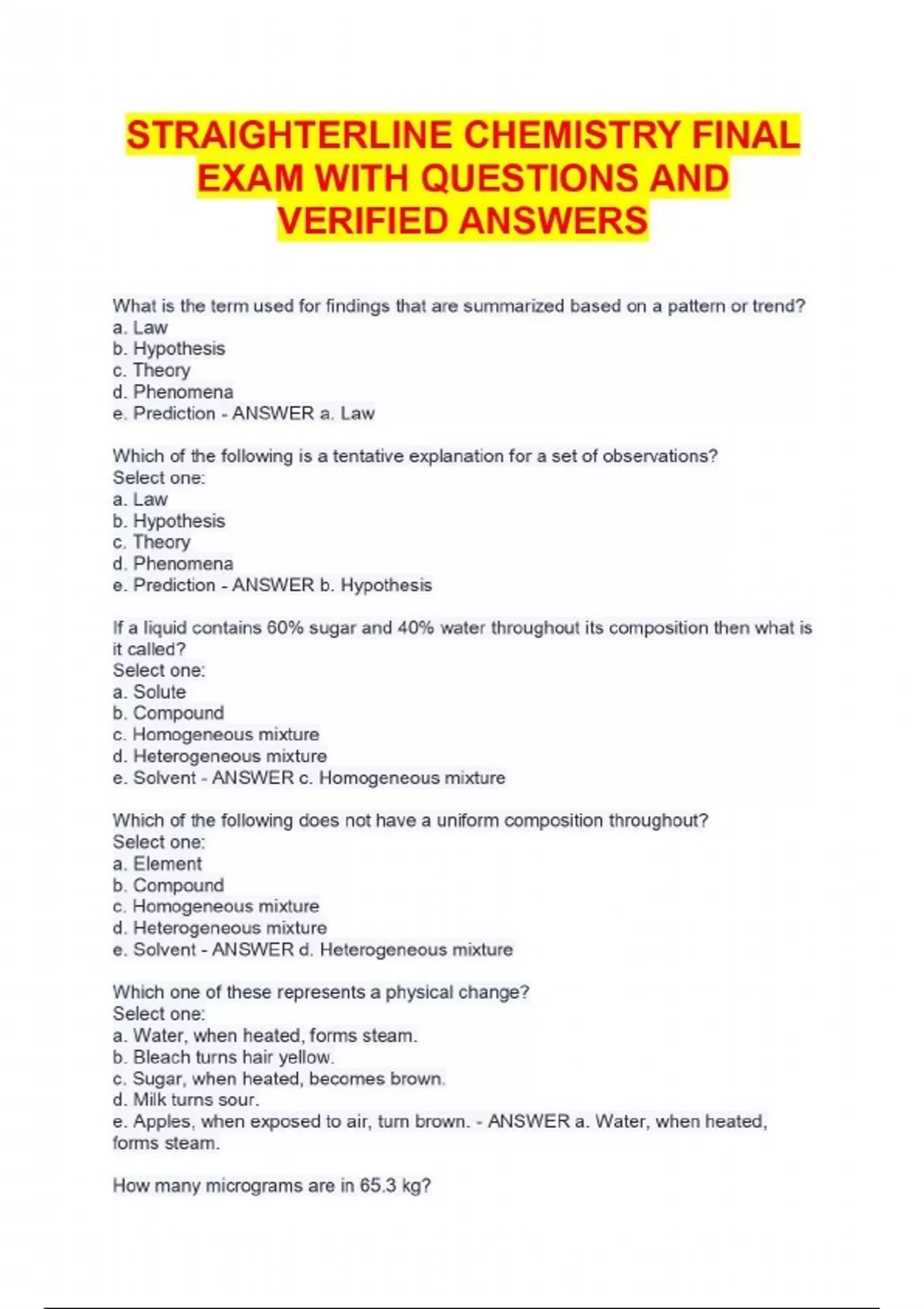 STRAIGHTERLINE CHEMISTRY FINAL EXAM WITH QUESTIONS AND VERIFIED ANSWERS