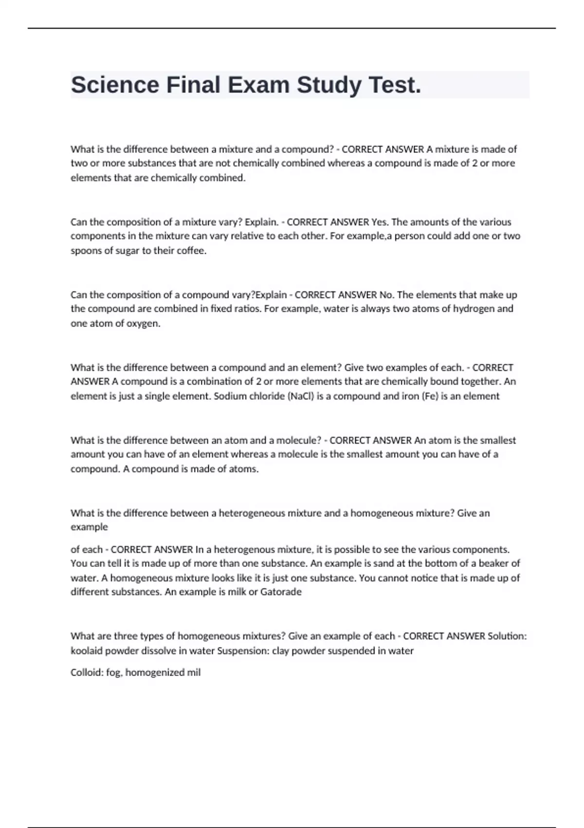 Science Study Exam Questions Correctly Answered.