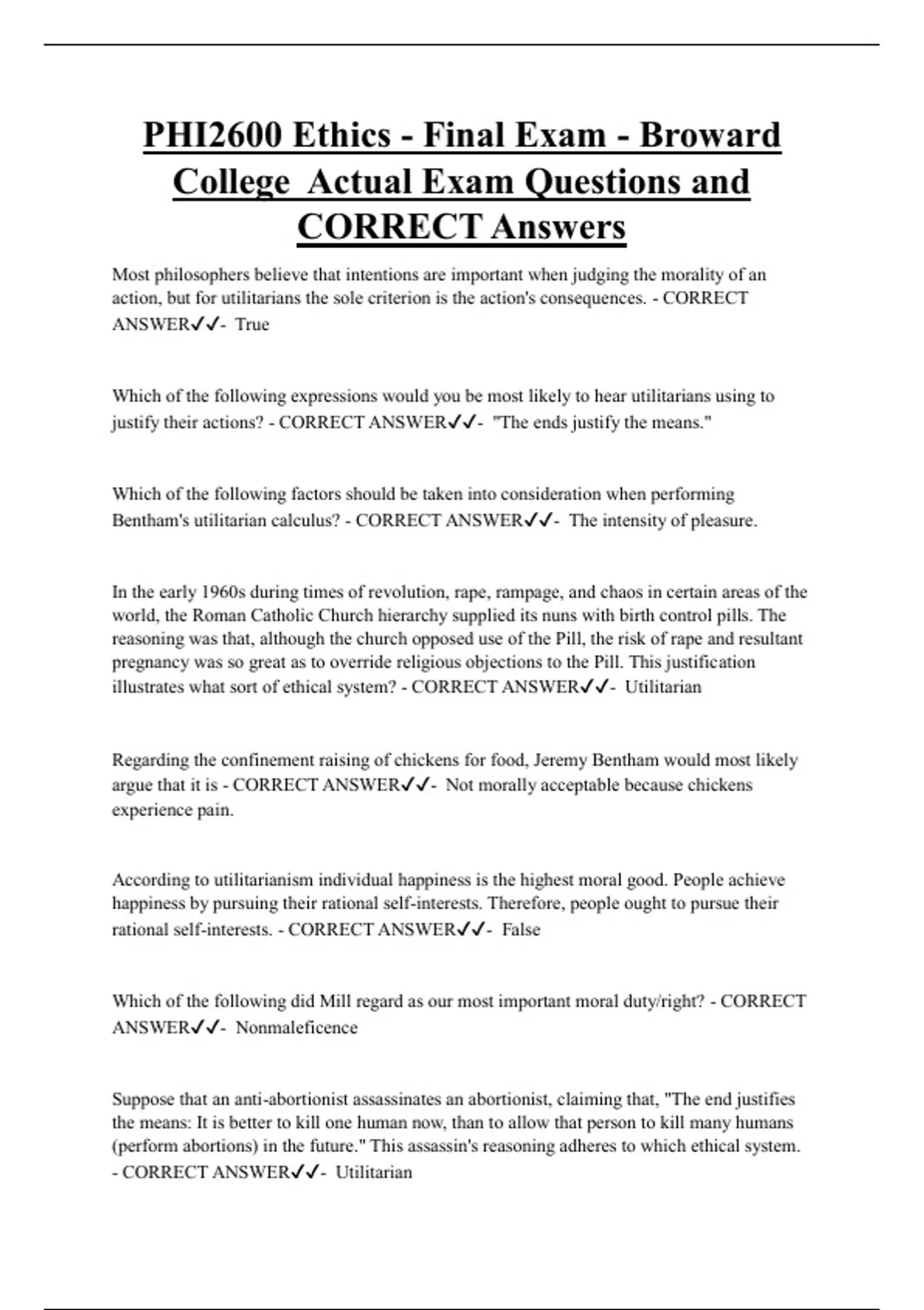 PHI2600 Ethics Bundled Exam Questions and CORRECT Answers