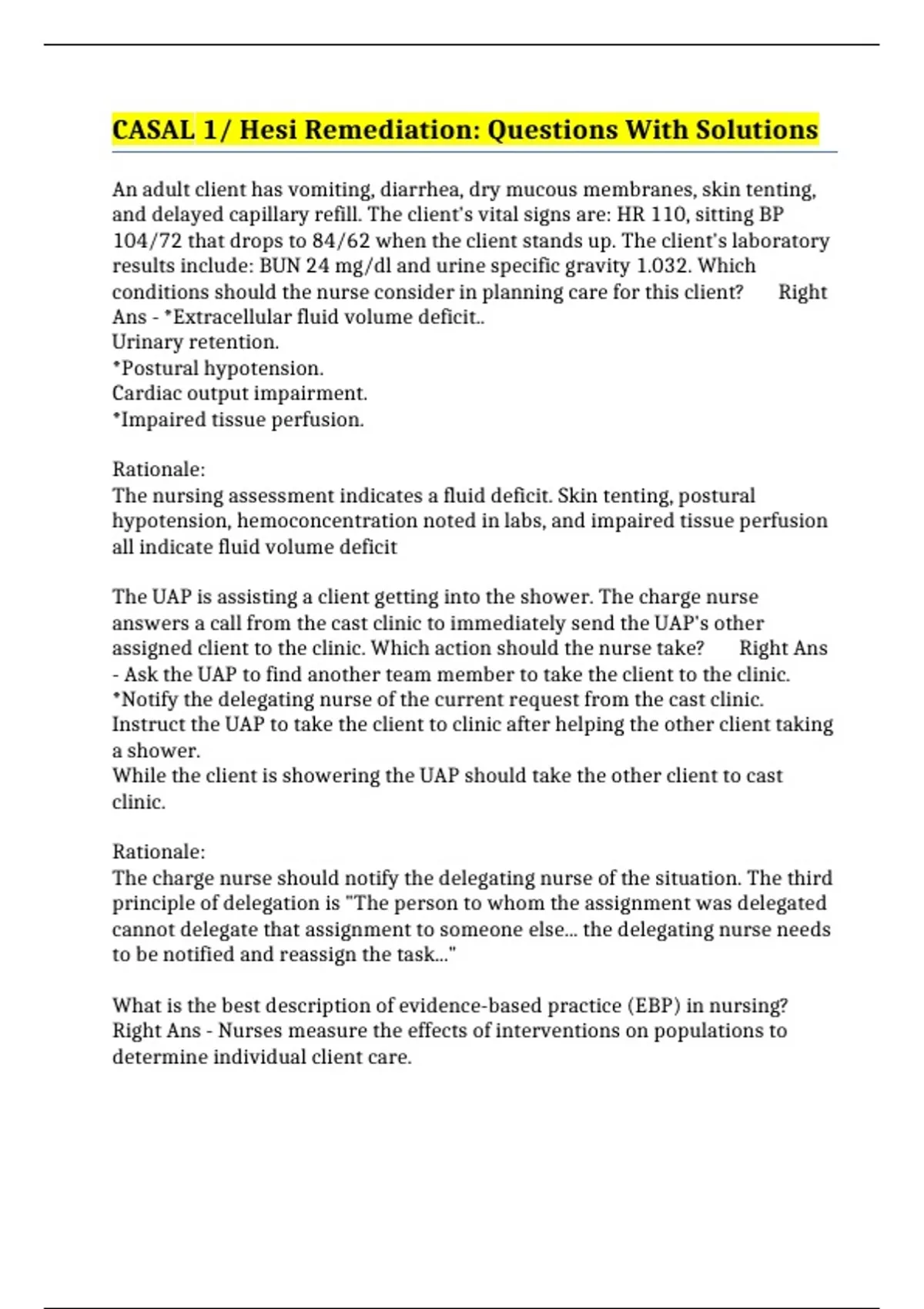 CASAL 1/ Hesi Remediation: Questions With Solutions