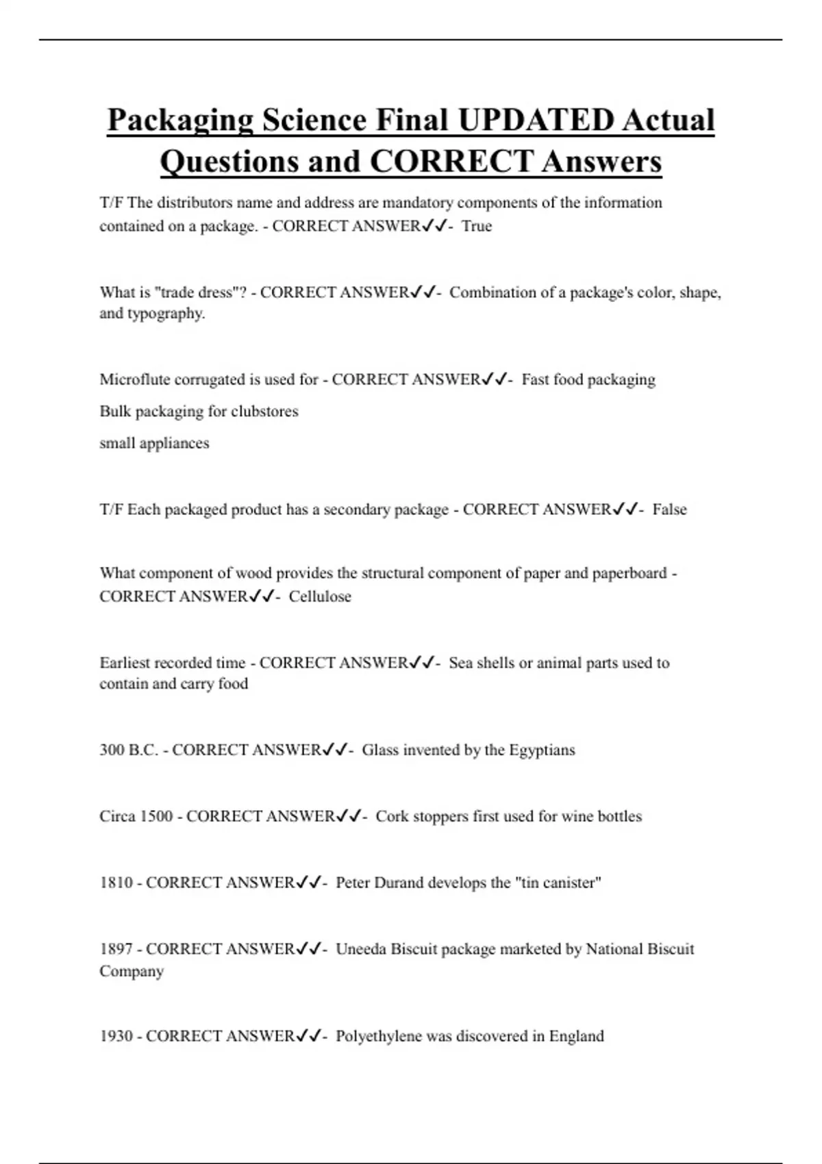 Packaging Science Bundled Exam Questions and CORRECT Answers