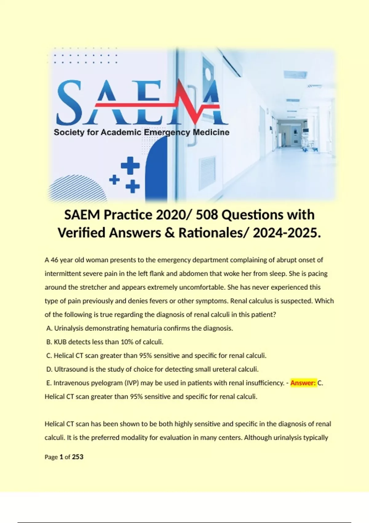 1 Exam (elaborations) ED SAEM Test/ 68 Quizzes & Correct Ans/ . 2 Exam (elaborations) Headache and Neurologic, SAEM Peds, SAEM - Procedures, Psych Emergencies, Derm, SAEM Tox, Infxn, Optho, Foreign Bodies, SAEM AMS, 2017 CV, 2017 trauma, SAEM MISC, SAEM - Shock and Sepsis, Environment and Endocrine, Pulm Emergencies/ 380+ Qs with Ans & De
