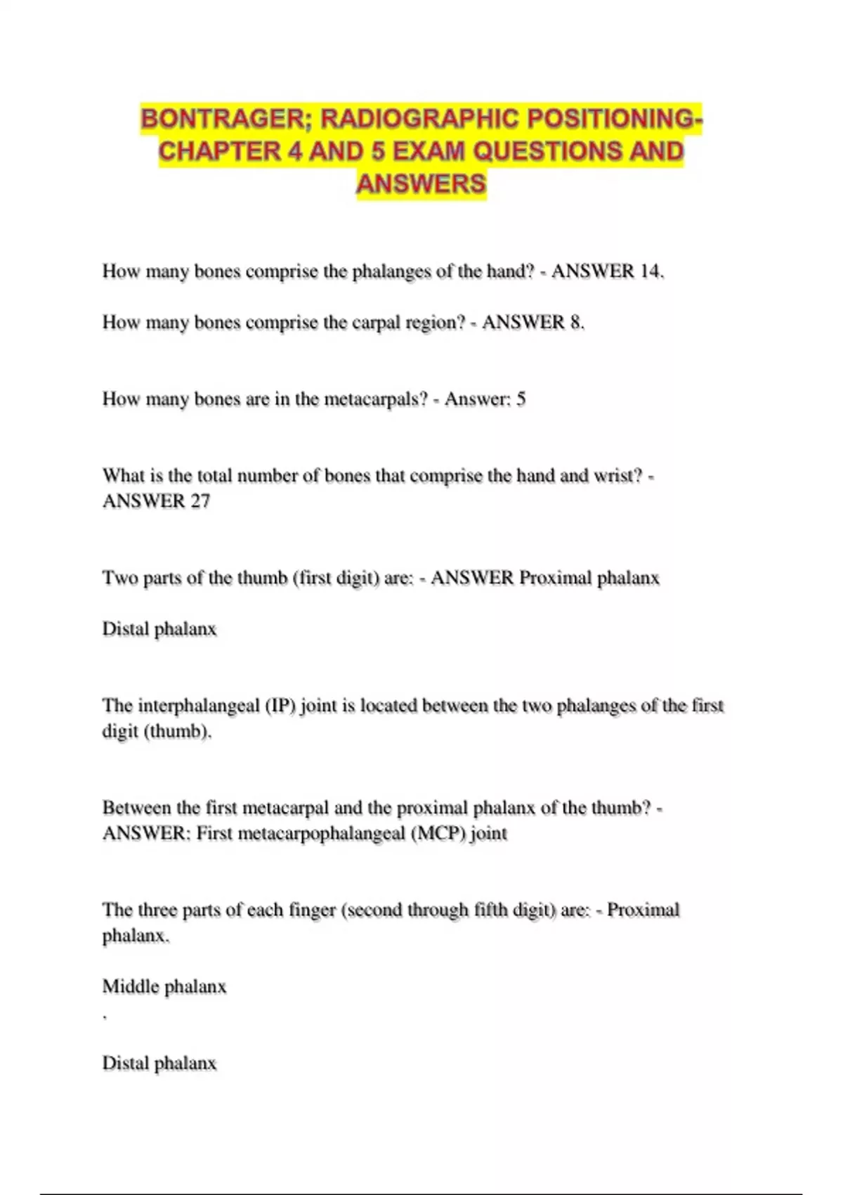BONTRAGER; RADIOGRAPHIC POSITIONING- CHAPTER 4 AND 5 EXAM QUESTIONS AND ANSWERS