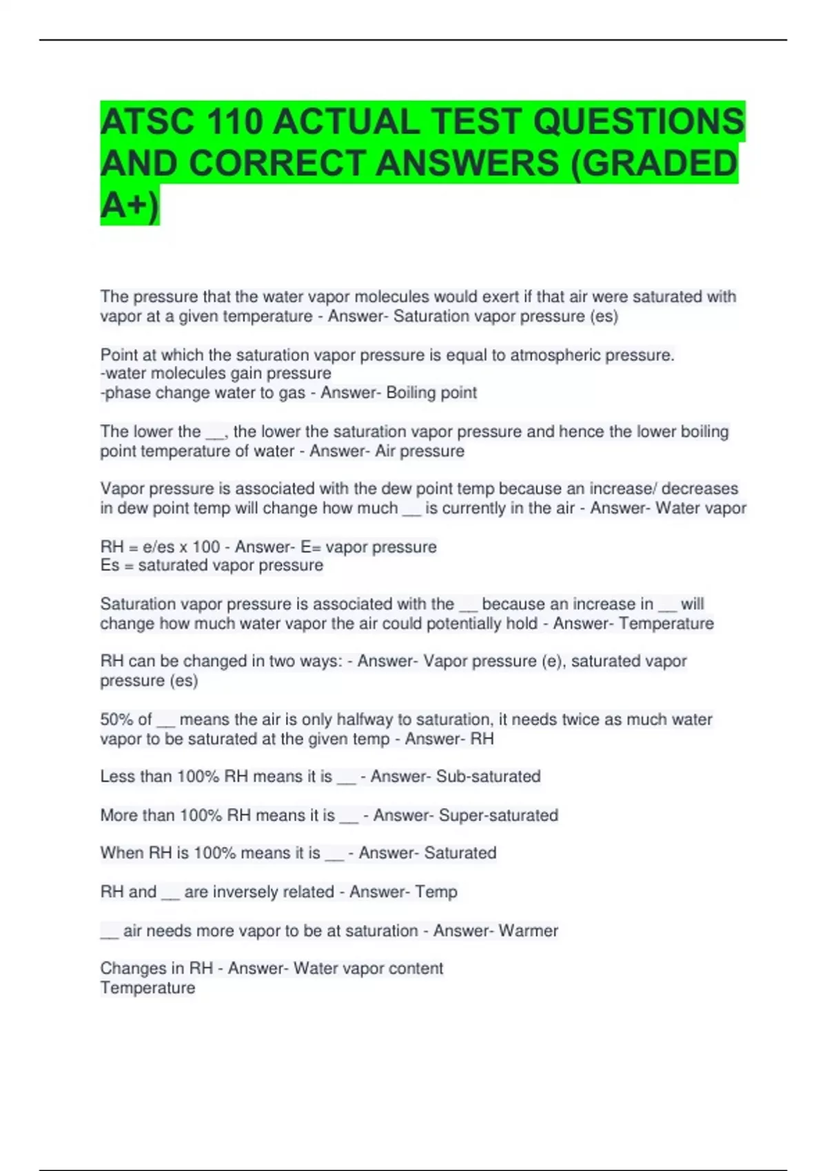 ATSC 110 ACTUAL TEST QUESTIONS AND CORRECT ANSWERS (GRADED A+) 2 Exam (elaborations) ATSC 110 Test 1 Questions with All Correct Answers 3 Exam (elaborations) ATSC 110 Test 3 Questions with All Correct Answers 4 Exam (elaborations) ATSC 110 Test 2 Questions and Answers All Correct 5 Exam (elaborations) ATSC 110 Meteorology Actual Exam Questions