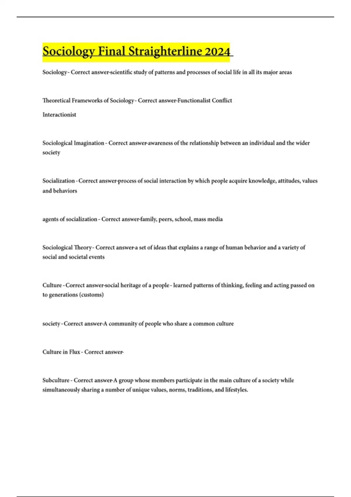1 Exam (elaborations) Sociology Final Straighterline Exam with 100% Correct Answers latest 2024 2 Exam (elaborations) Sociology final straighter line Exam 2024 3 Exam (elaborations) Sociology 101 Straighter line final exam with 100% Correct Answers 2024 4 Exam (elaborations) Soc 101 Straighter line final Exam Emile Durkheim s explanation 2024 5