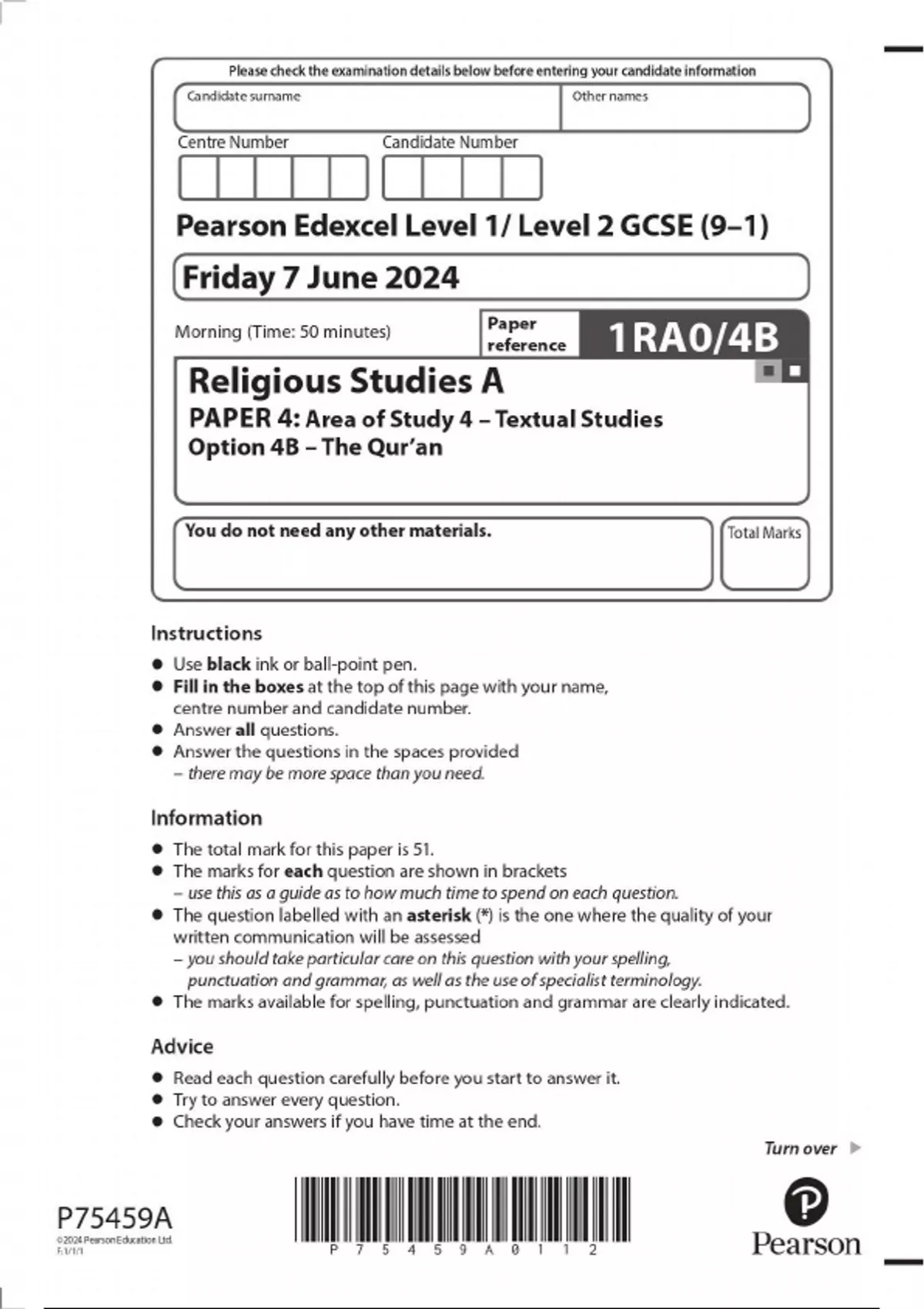 2024 EDEXCEL GCSE RELIGIOUS STUDIES A PAPER 4 OPTION 4B: THE QUR'AN INCLUDING MARK SCHEME