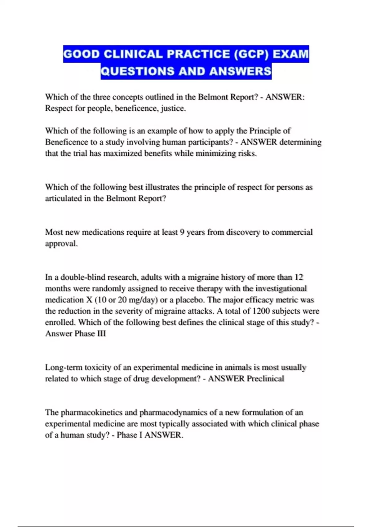 GOOD CLINICAL PRACTICE (GCP) EXAM QUESTIONS AND ANSWERS