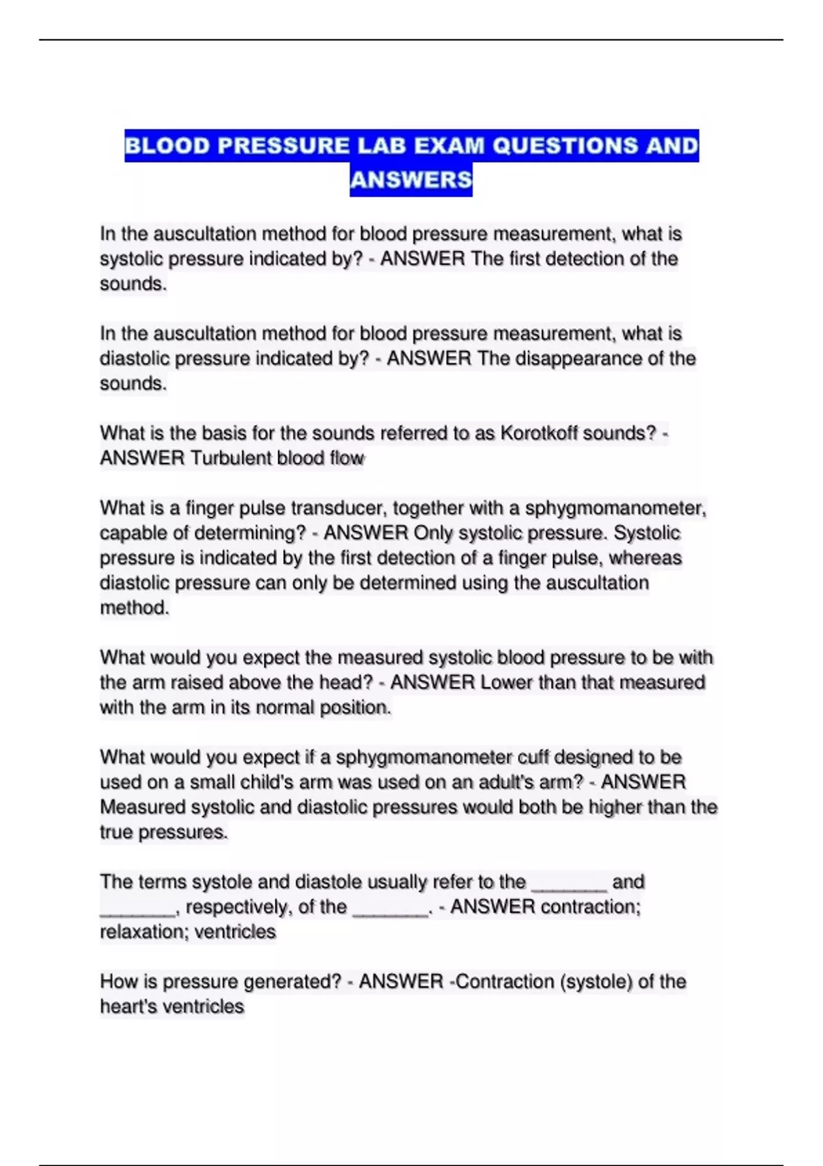 BLOOD PRESSURE LAB EXAM QUESTIONS AND ANSWERS