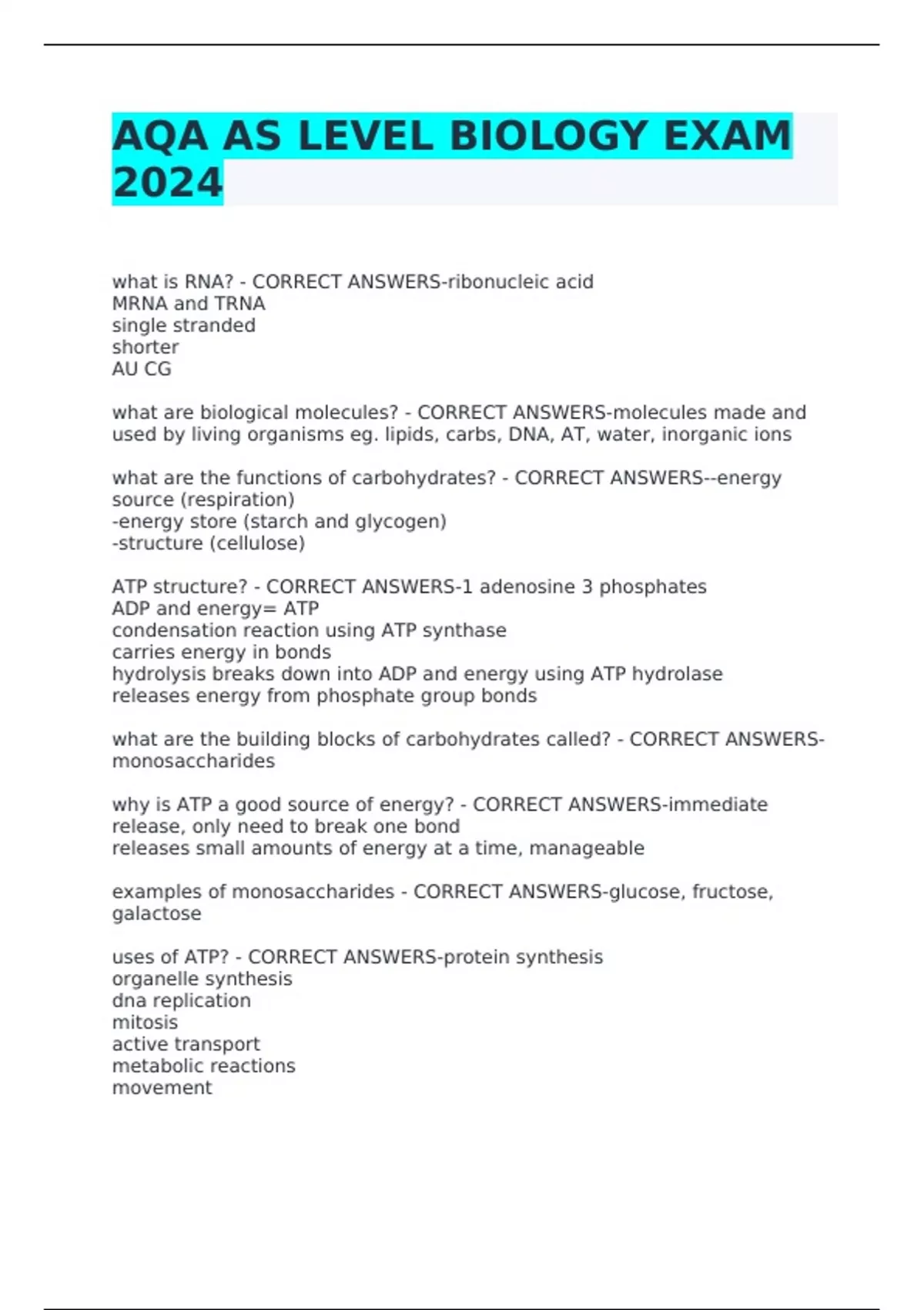 2024 AQA A LEVEL BIOLOGY IMMUNITY UNIT 1, AQA AS LEVEL BIOLOGY EXAM QUESTIONS WITH CORRECT ANSWERS 2024 AQA AS BIOLOGY PAPER 1 EXAM QUESTIONS WITH CORRECT ANSWERS 2024 AQA AS BIOLOGY PAPER 2 EXAM WITH CORRECT ANSWERS 2024 AQA AS BIOLOGY CELL STRUCTURE EXAM QUESTIONS WITH CORRECT ANSWERS 2024 AQA AS LEVEL BIOLOGY EXAM WITH 100% VALID ANSWERS AQA A