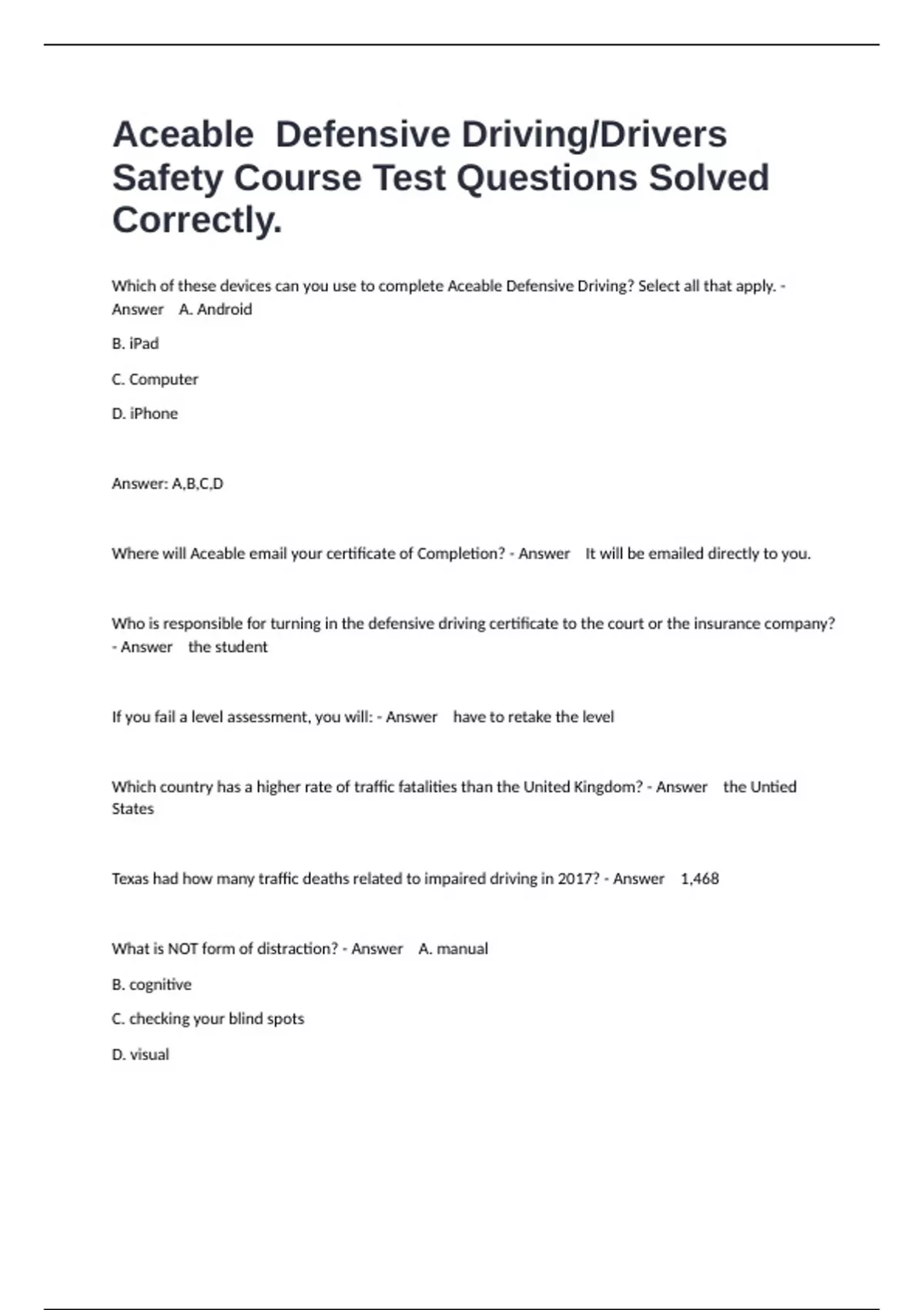 1 Exam (elaborations) Texas Defensive Driving Practice Exam And Already Passed Answers. 2 Exam (elaborations) Aceable Level 3 Prep Exam Questions And 100% Correct Answers. 3 Exam (elaborations) Aceable Level 2 Assessment Questions Answered Corrrectly. 4 Exam (elaborations) Aceable Final Exam Questions With Guaranteed Pass Solutions. 5 Exam (ela