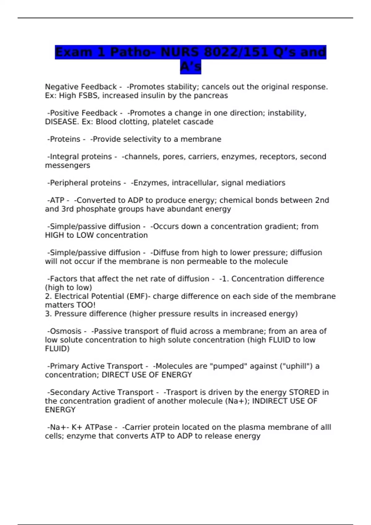 Exam 1 Patho- NURS 8022/151 Q’s and A’s