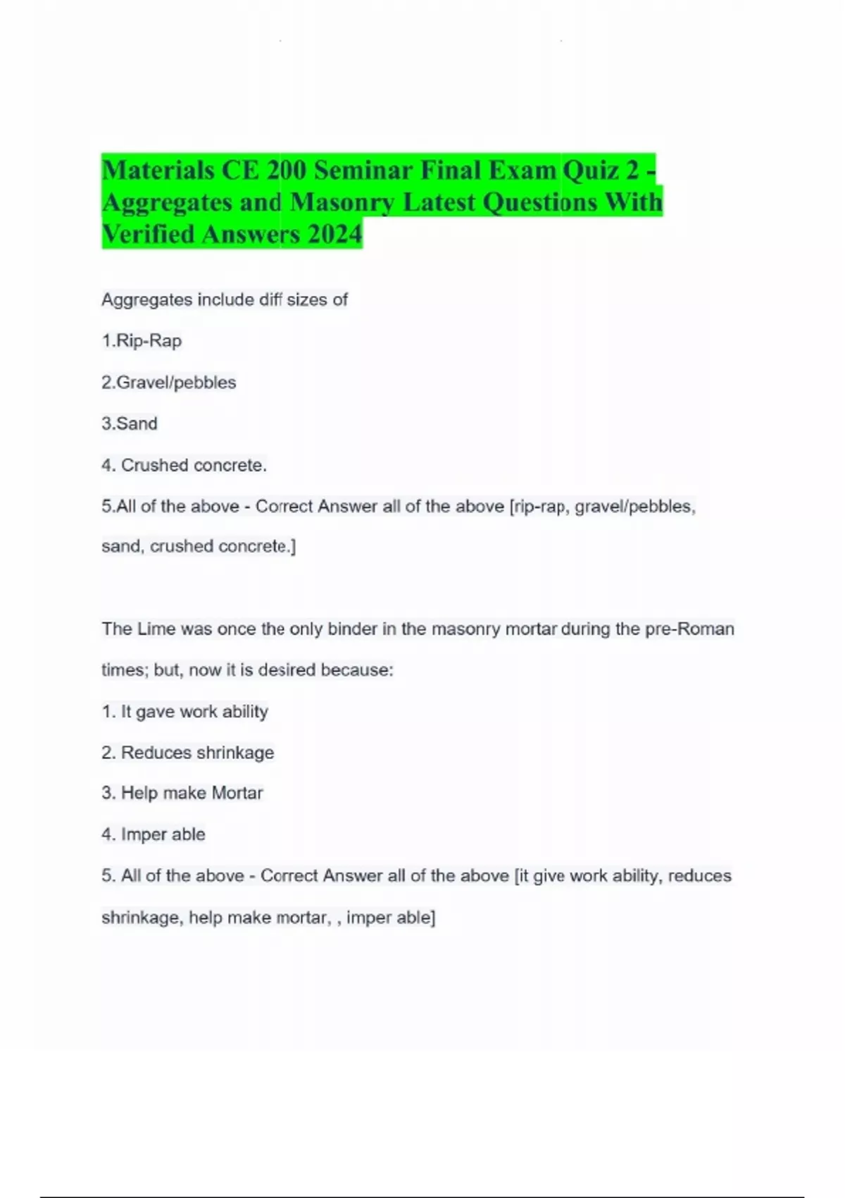 Materials CE 200 Seminar Final Exam Quiz 2 - Aggregates and Masonry Latest Questions With Verified Answers 2024 Materials CE 200 Seminar Final Exam Quiz 2 - Aggregates and Masonry | CE 200 Quiz 2 Questions With Correct Answer 2024 CE 200 Quiz 2 | Materials CE 200 Seminar | Aggregates and Masonry | Latest Exam| Questions With Verified Answers 2024