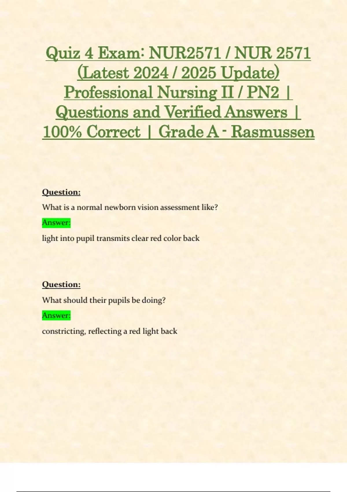 Exam 2 Quiz 4 - 6: NUR2571 / NUR 2571 (Latest Update 2024 / 2025 STUDY BUNDLE WITH COMPLETE SOLUTION) Professional Nursing II / PN2 | Questions and Verified Answers | 100% Correct | Graded A - Rasmussen