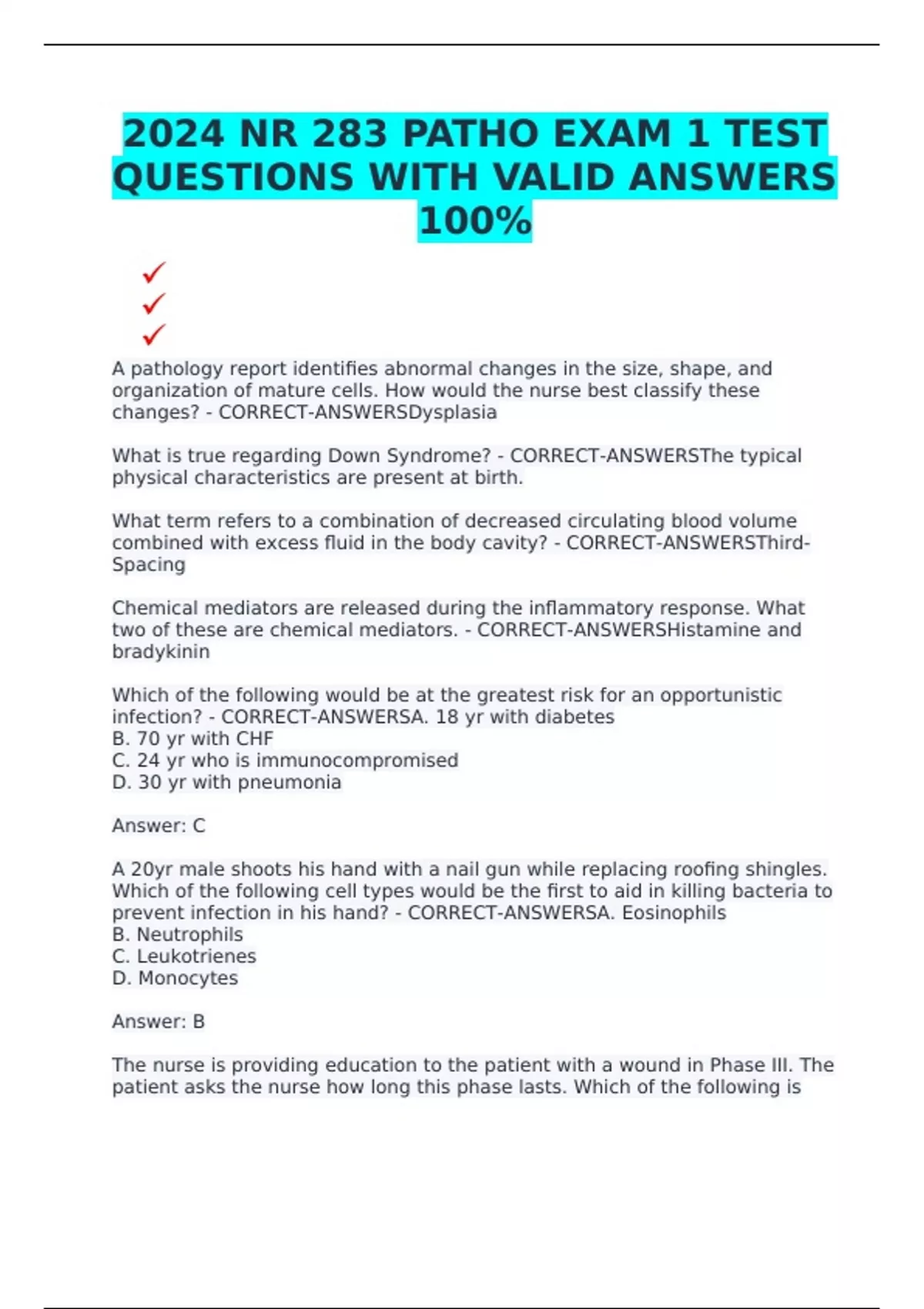 2024 NR 283 PATHOPHYSIOLOGY EXAM 2 WITH CORRECT ANSWERS 2024 CHAMBERLAIN PATHOPHYSIOLOGY NR283 FINAL EXAM WITH CORRECT ANSWERS 2024 NR 283 PRACTICE EXAM QUESTIONS WITH CORRECT ANSWERS 2024 NR 283 FINAL EXAM STUDY GUIDE WITH CORRECT ANSWERS 2024 NR 283 EXAM 1 WITH CORRECT ANSWERS 2024 NR 283 CONTENT QUIZ 1 EXAM WITH CORRECT ANSWERS 2024 NR 283 EXAM