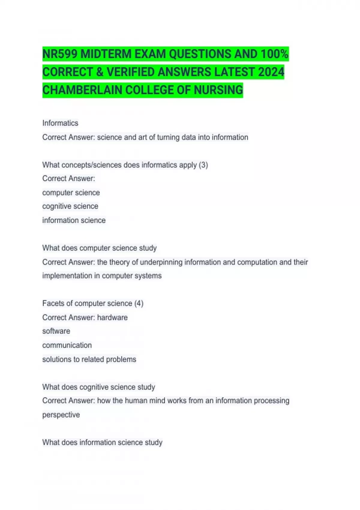 NR599 Final Exam Study Guide Questions With Complete Solutions 2024 NR599 MIDTERM EXAM QUESTIONS AND 100% CORRECT & VERIFIED ANSWERS LATEST 2024 CHAMBERLAIN COLLEGE OF NURSING