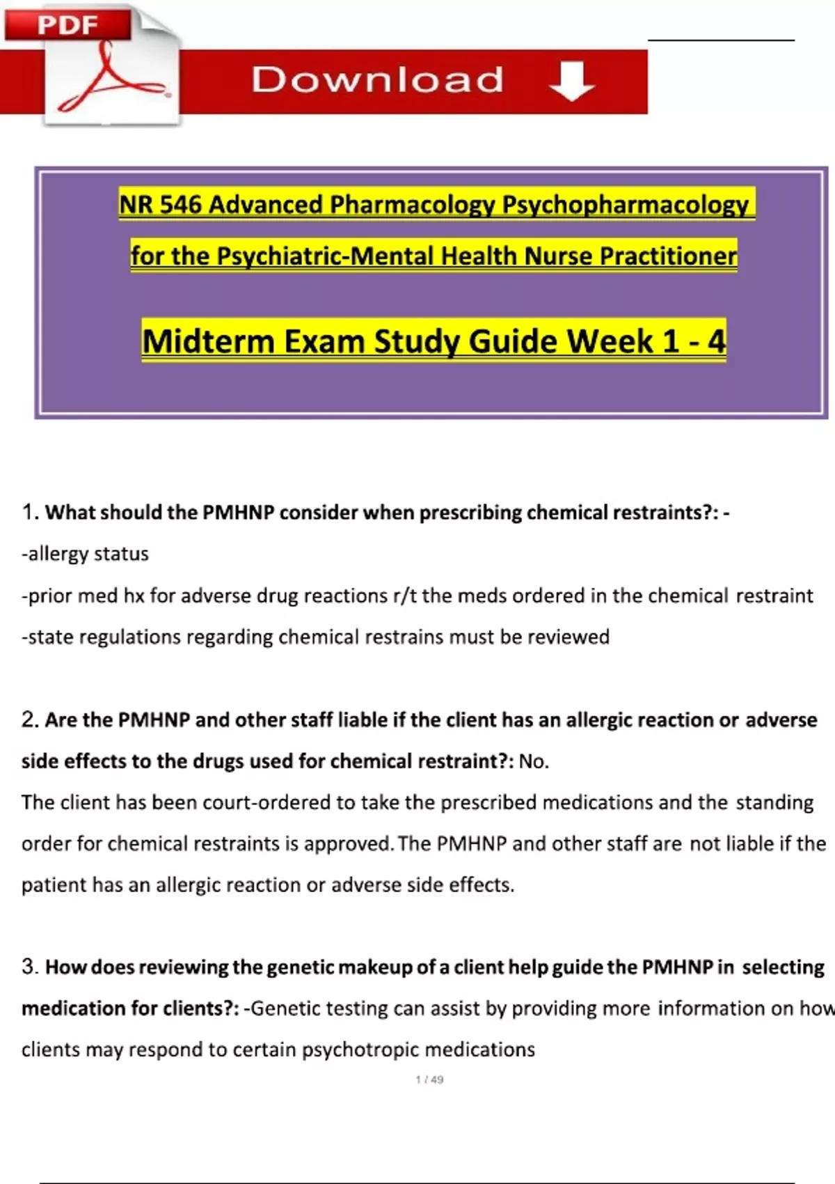 NR546 / NR 546 Midterm & Final Exam Study Guide (Week 1 - 8) (2024 / 2025): Advanced Pharmacology Psychopharmacology for the Psychiatric-Mental Health Nurse Practitioner - Chamberlain NR546 / NR 546 Midterm & Final Exam Study Guide (Week 1 - 8) (2024 / 2025): Advanced Pharmacology Psychopharmacology for the Psychiatric-Mental Health Nurse Practiti