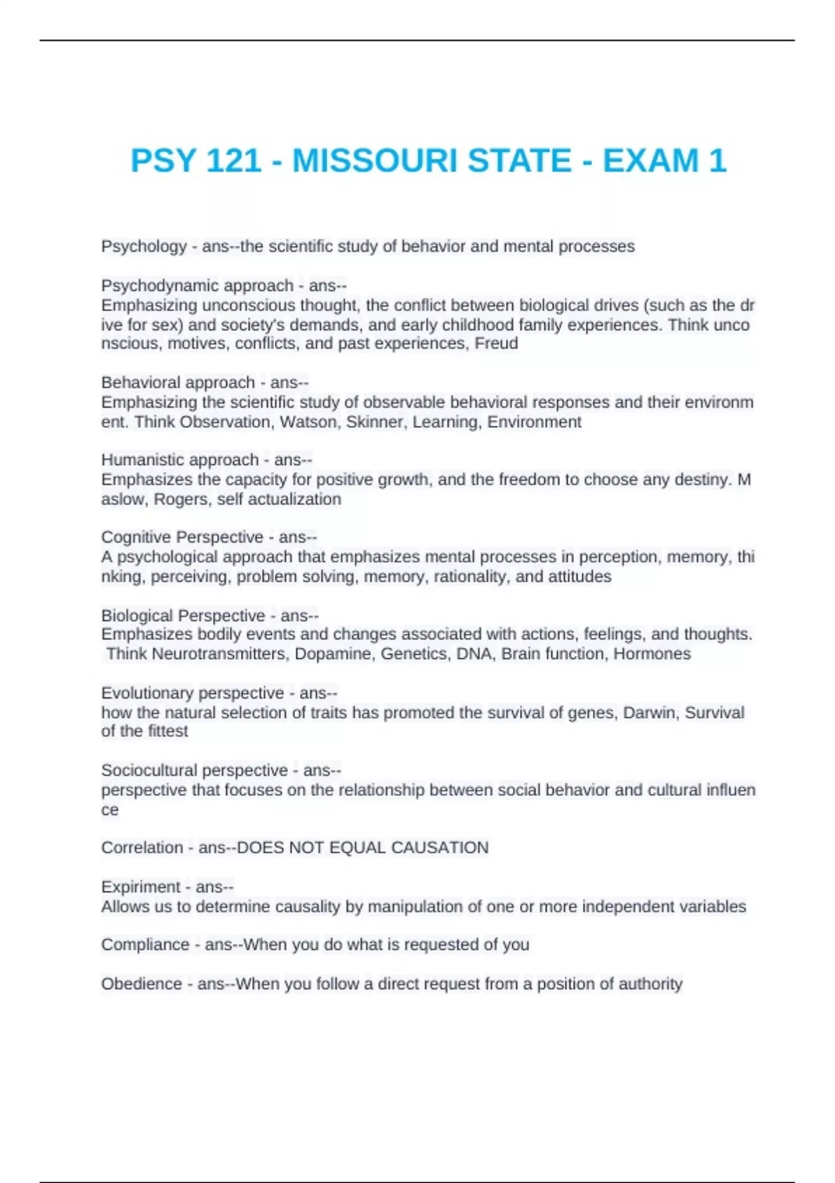PSY 121 EXAM 1 QUESTIONS AND ANSWERS