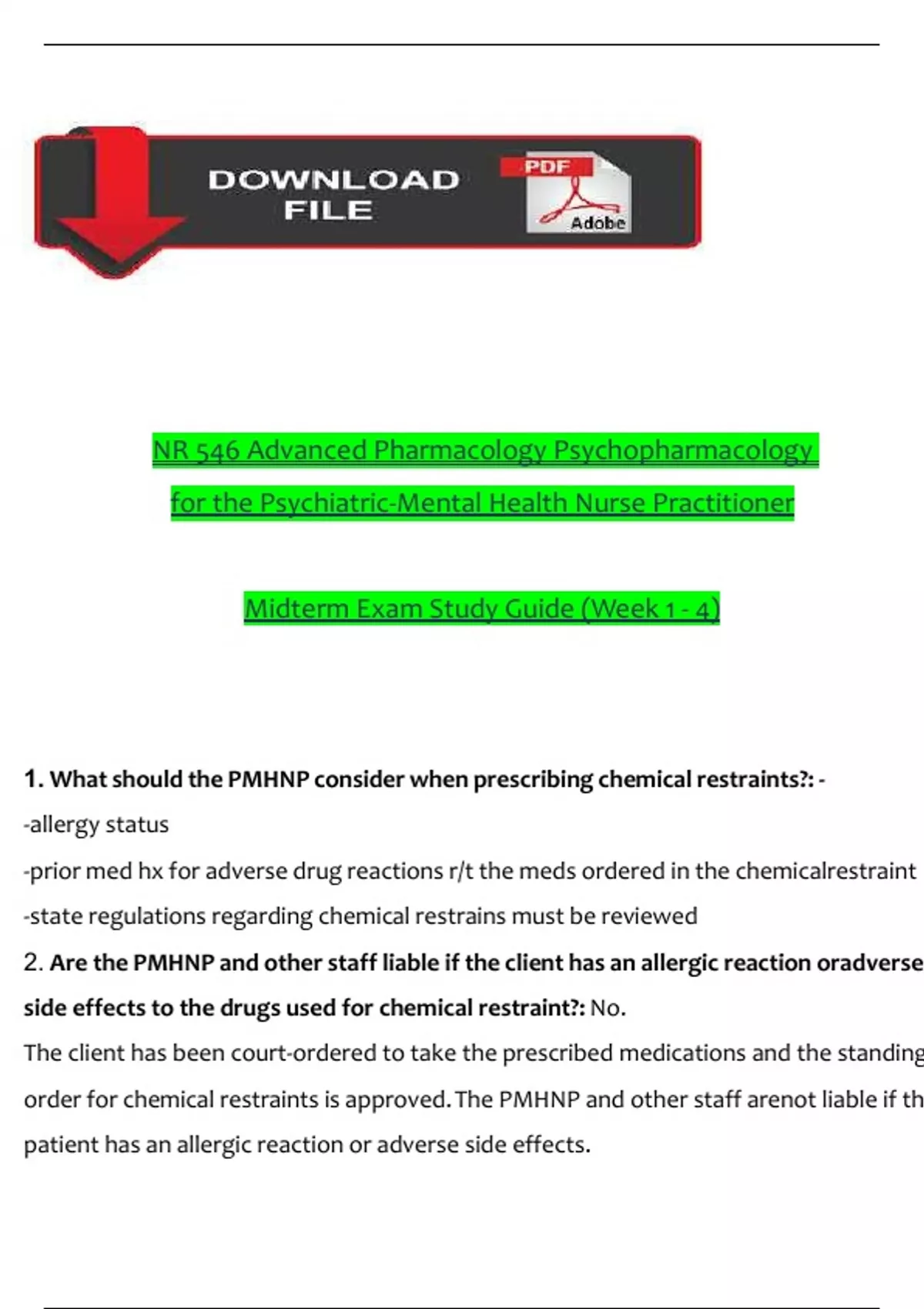 NR 546 Midterm Exam 2024 / NR 546 Week 1 - 4 Exam Advanced Pharmacology Psychopharmacology for the Psychiatric-Mental Health Nurse Practitioner, (2024 / 2025) Expected Questions and Answers STUDY BUNDLE (COMPLETE PACKAGE)