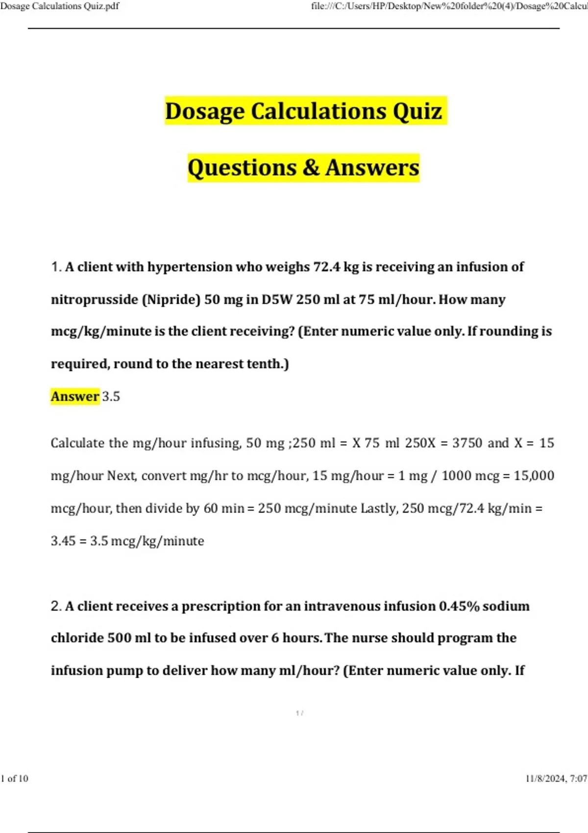 Dosage Calculations Practice Exams BUNDLED ATI Medication Administration (Dosage Calculation) Dosage Calculations Practice Updated Questions and Answers (2024/2025) (Verified Answers)